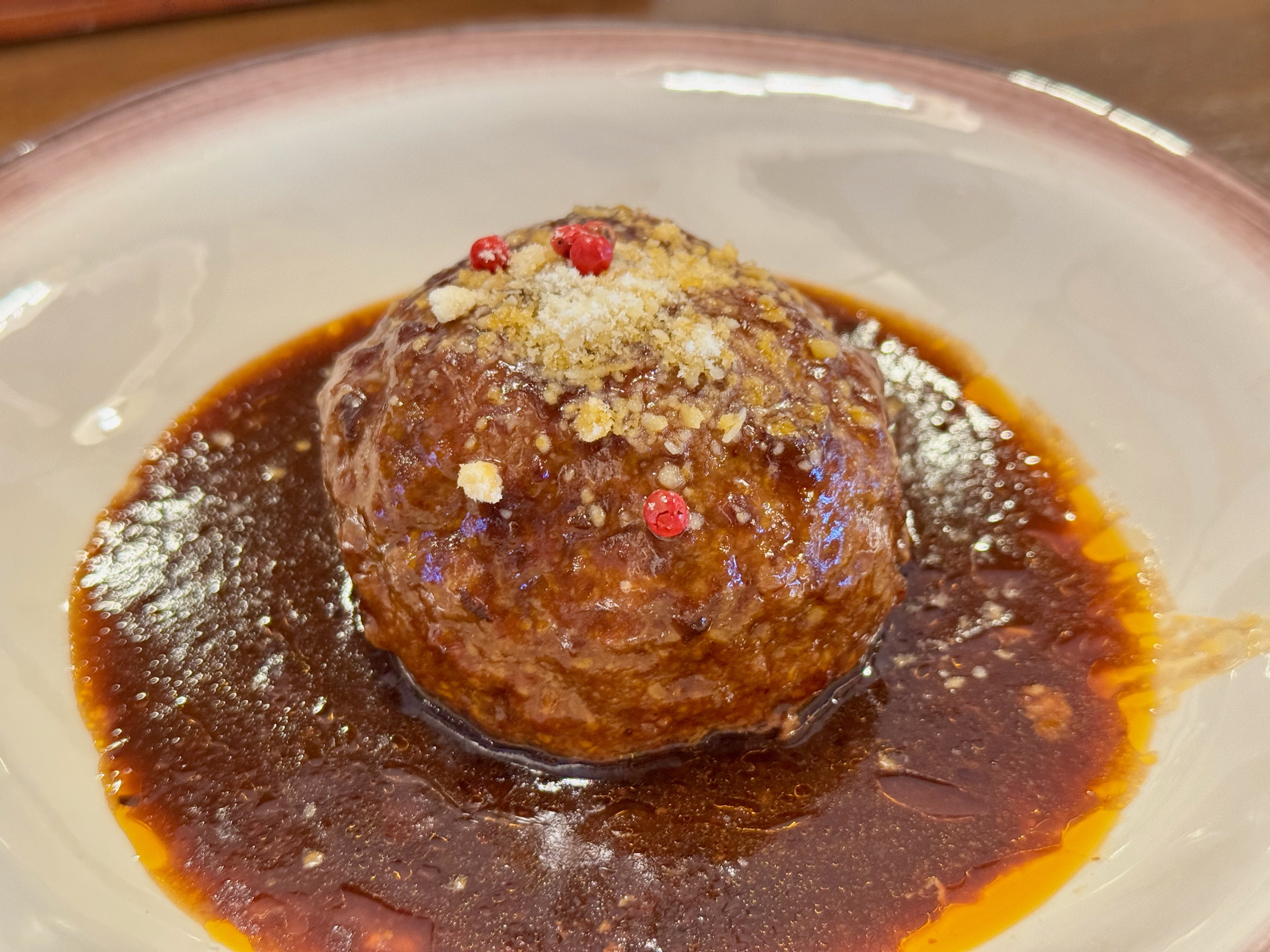 粗挽き寄りの食感で、肉の旨みをしっかり感じられるタイプながら、口当たりは驚くほど柔らかく、重たさを感じさせないバランスに仕上がっています。