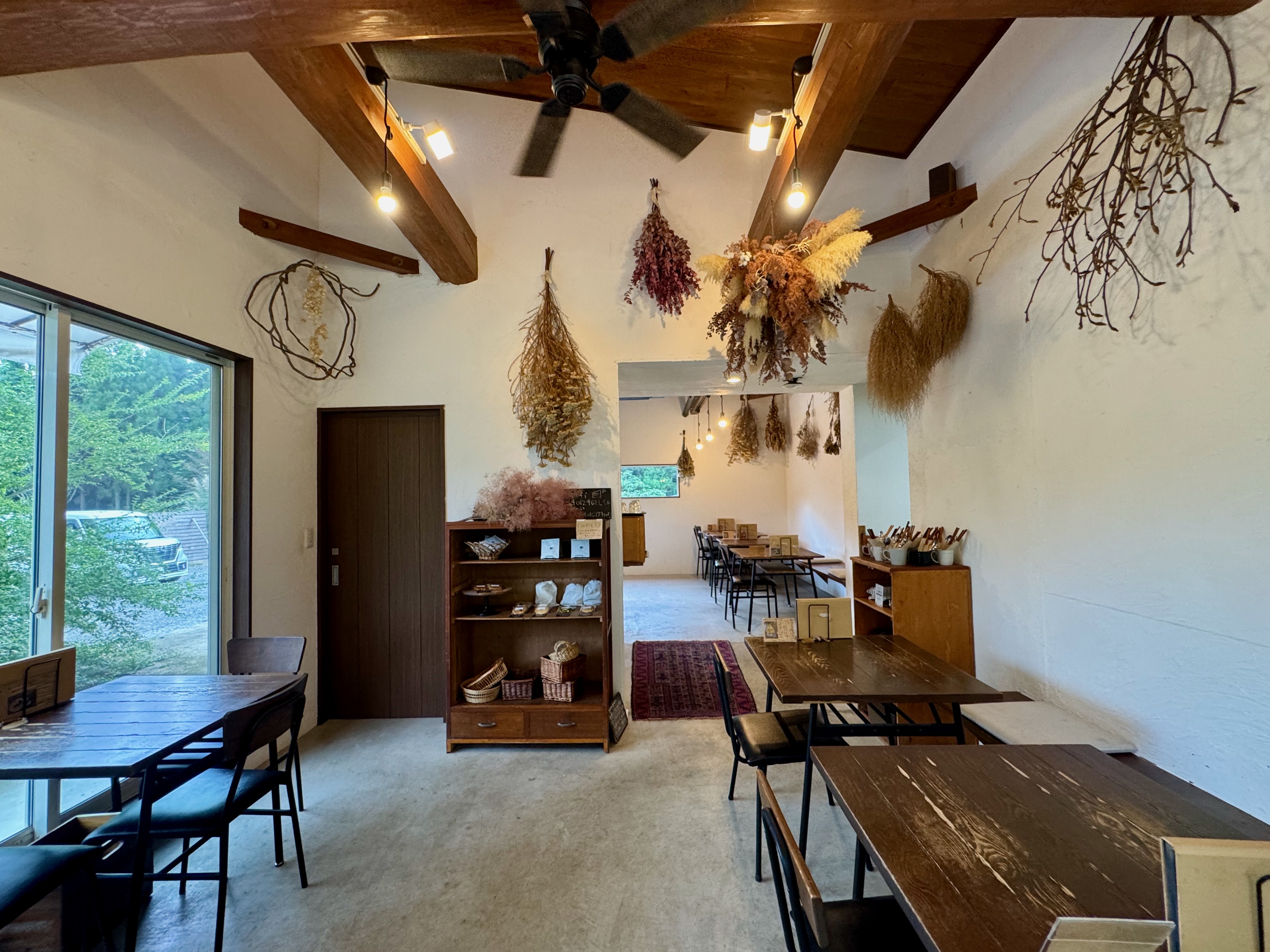 店内に入ると、温もりが広がる優しい空間。高い天井にはシーリングファン、壁にはドライフラワー、店内BGMにはダイアナ・パントンなどのジャズが流れていて、「おしゃれだけど居心地がいい」ことが口コミでも評判です。
