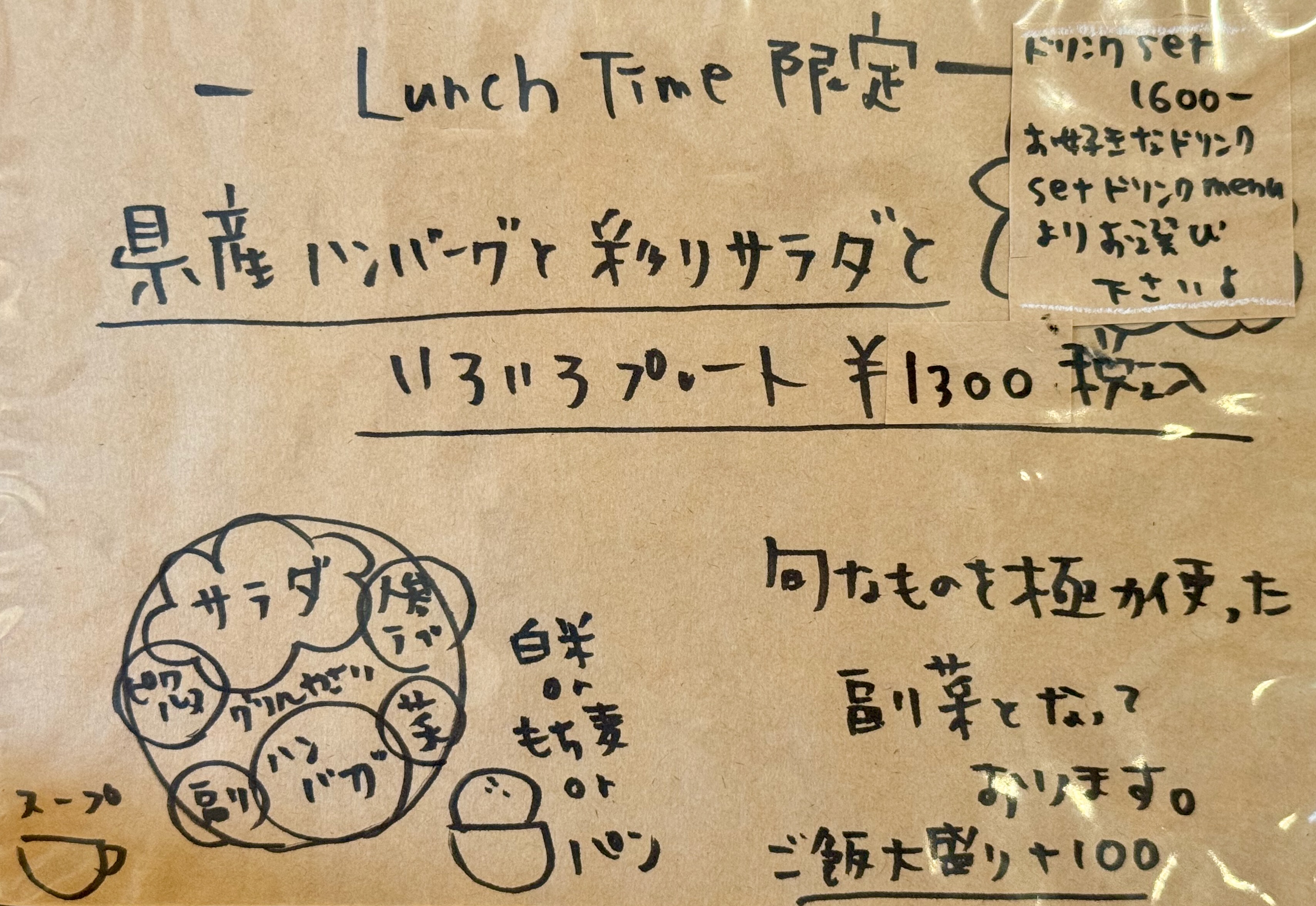 一番人気は「県産ハンバーグと彩りサラダといろいろプレート」。ランチタイム限定で14時頃まで提供しています。