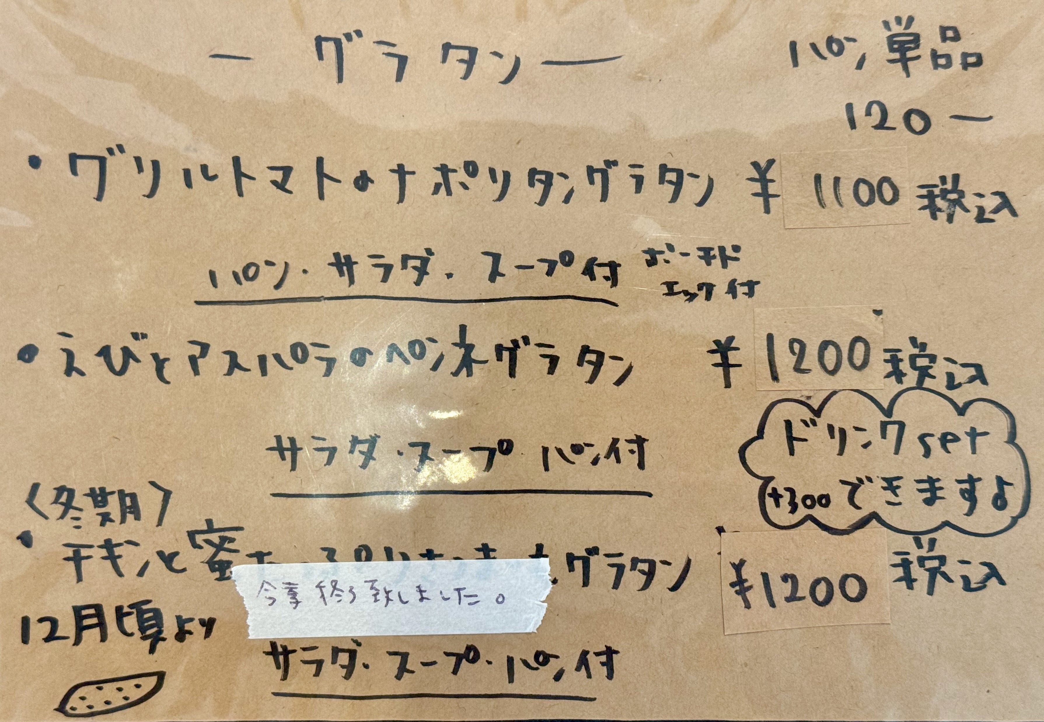 「グリルトマトのナポリタングラタン」には、パン・サラダ・スープがセットになっています。