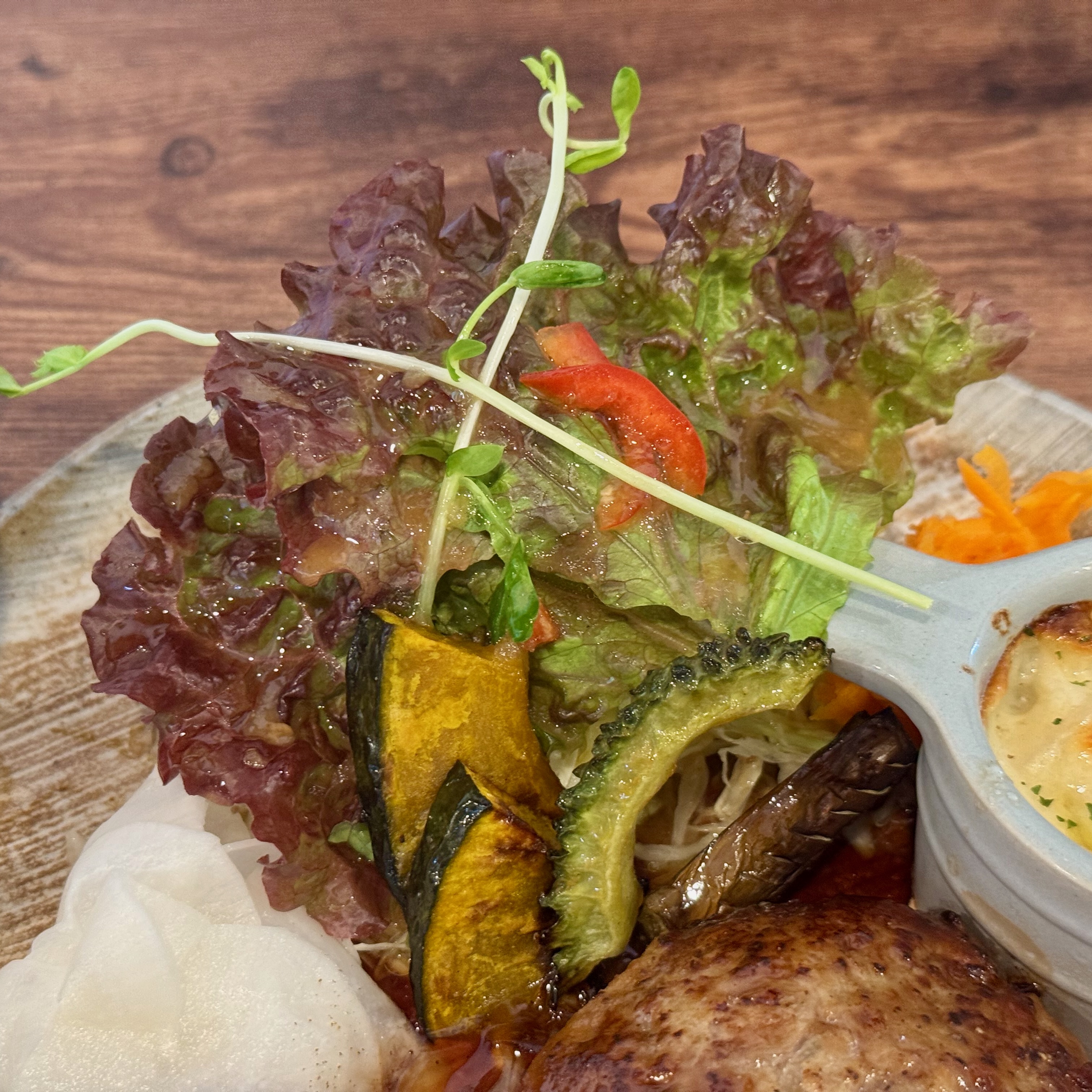 ロコモコやオムライス、グラタンなど、旬の野菜をたっぷりと使った料理が評判です。手作り感たっぷりで、どれも彩り豊かです。