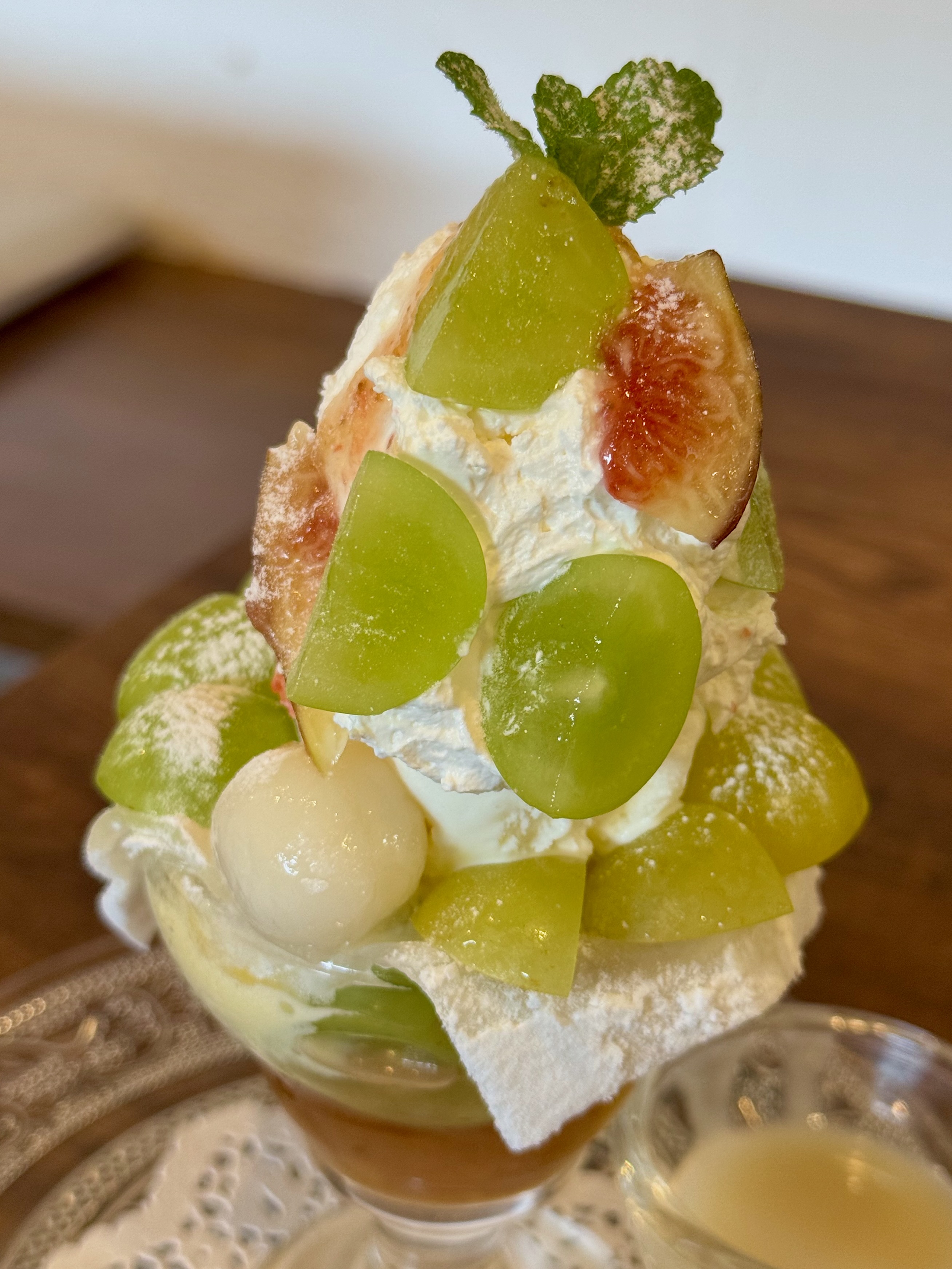 楽しみなのが季節限定のパフェ・・この日は高級マスカットを使用した「まるでシャインマスカット大福パフェ〜時々いちぢく」が期間限定で登場していました。