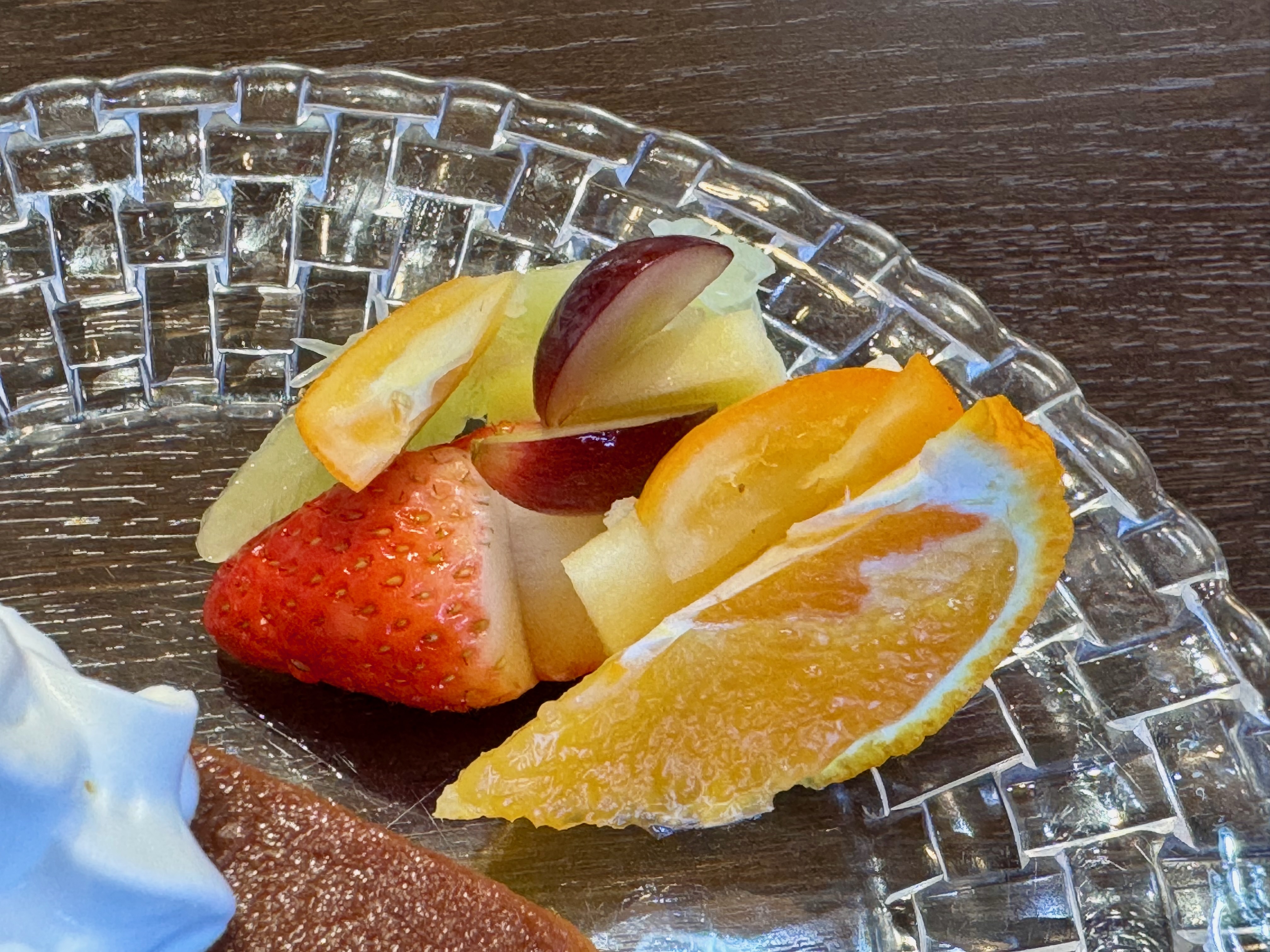 ケーキセットにすると、いちご、オレンジ、リンゴなどのフルーツがプレートに盛り付けられているのが嬉しいですね。