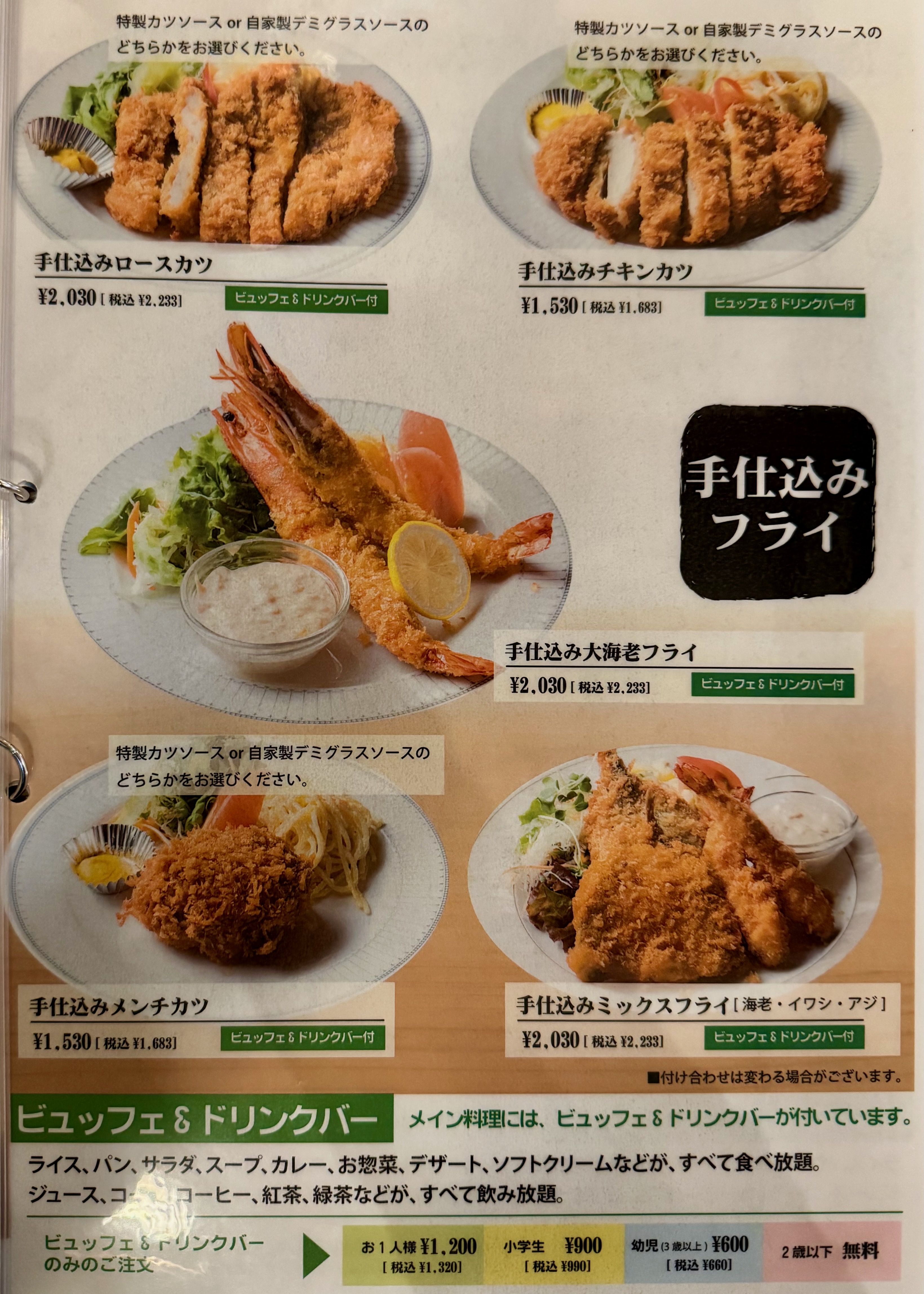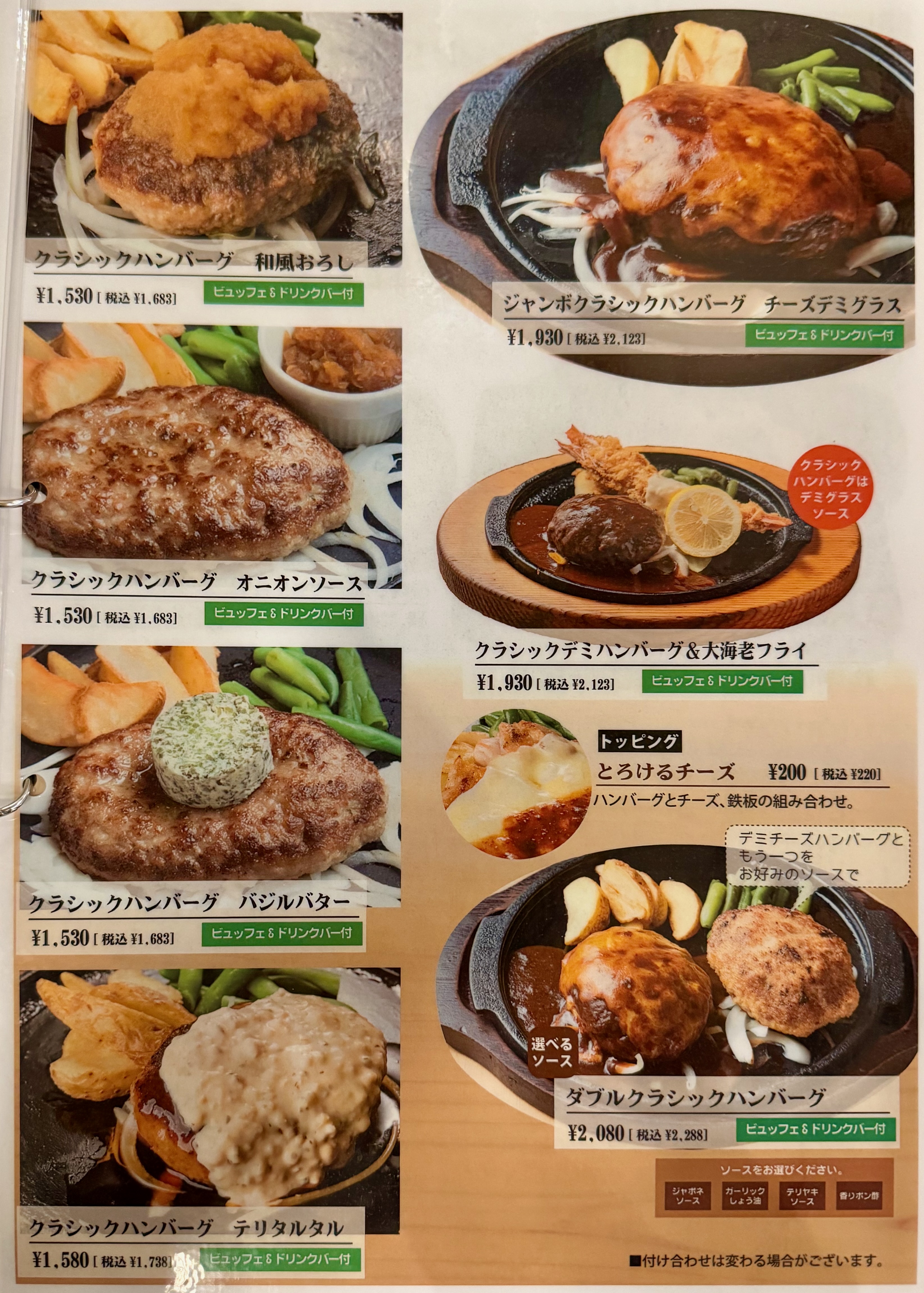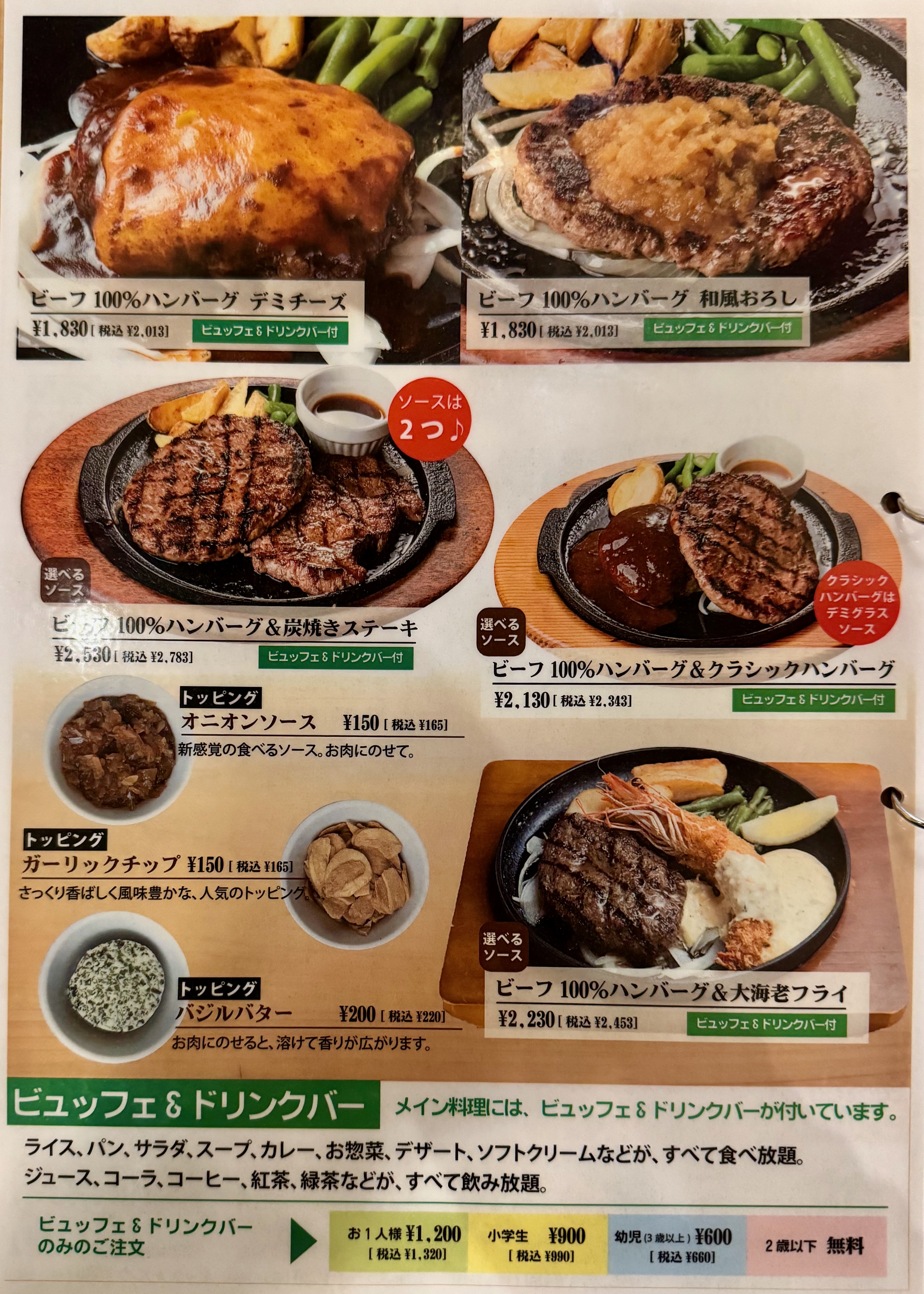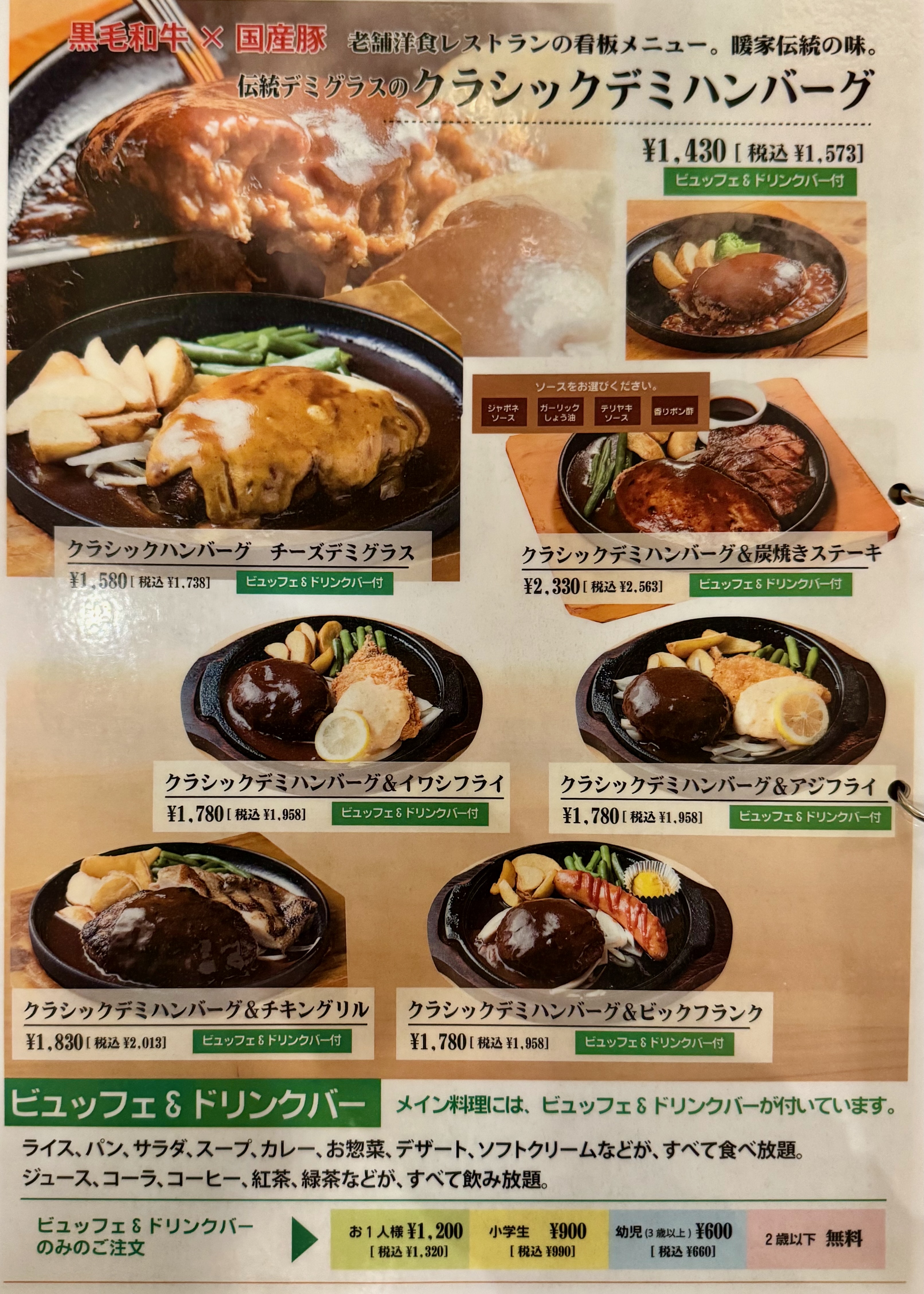 ハンバーグ、ステーキ、チキン南蛮などの洋食系に加え、ビュッフェやドリンクバーを組み合わせて楽しむスタイルが人気です。