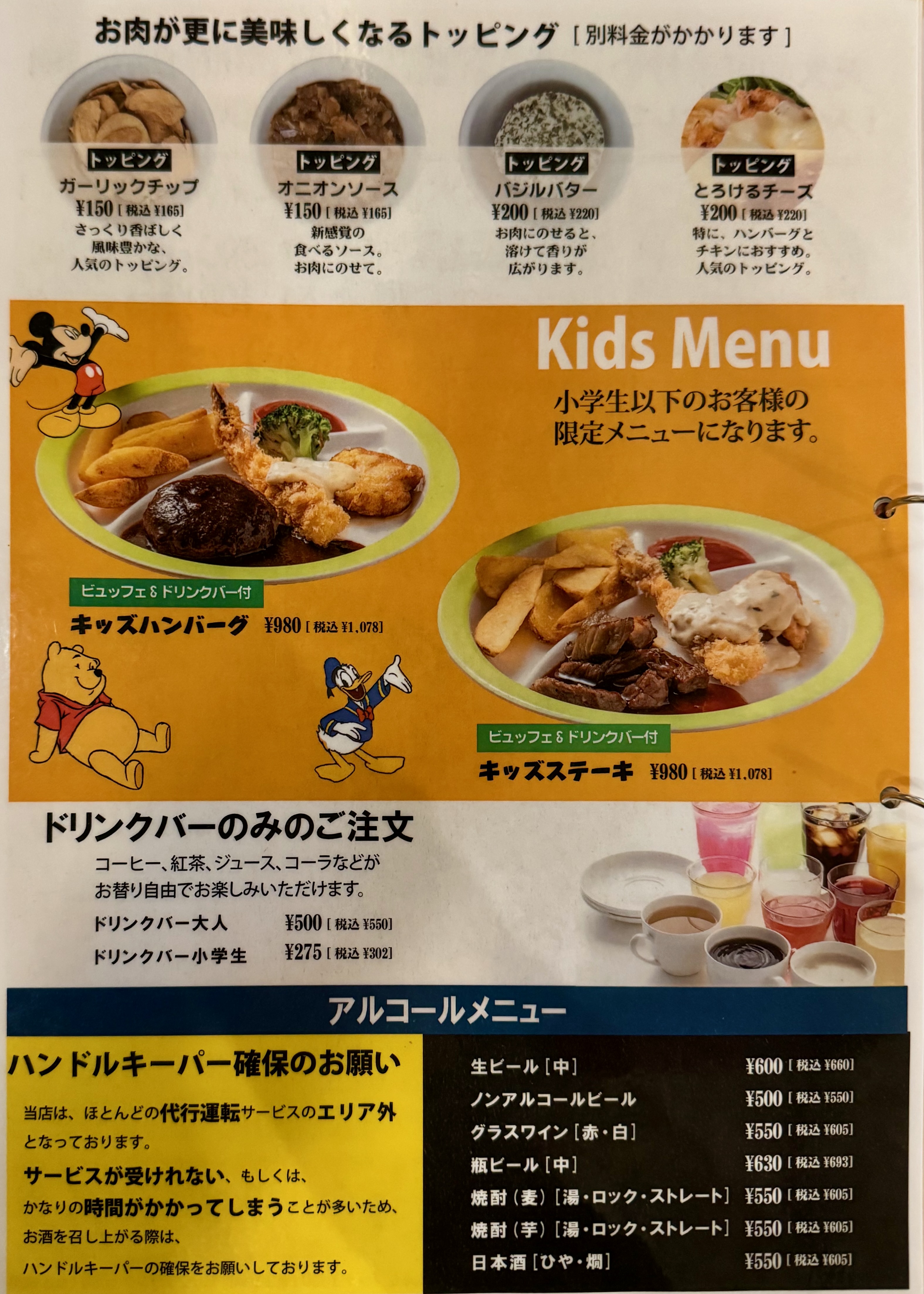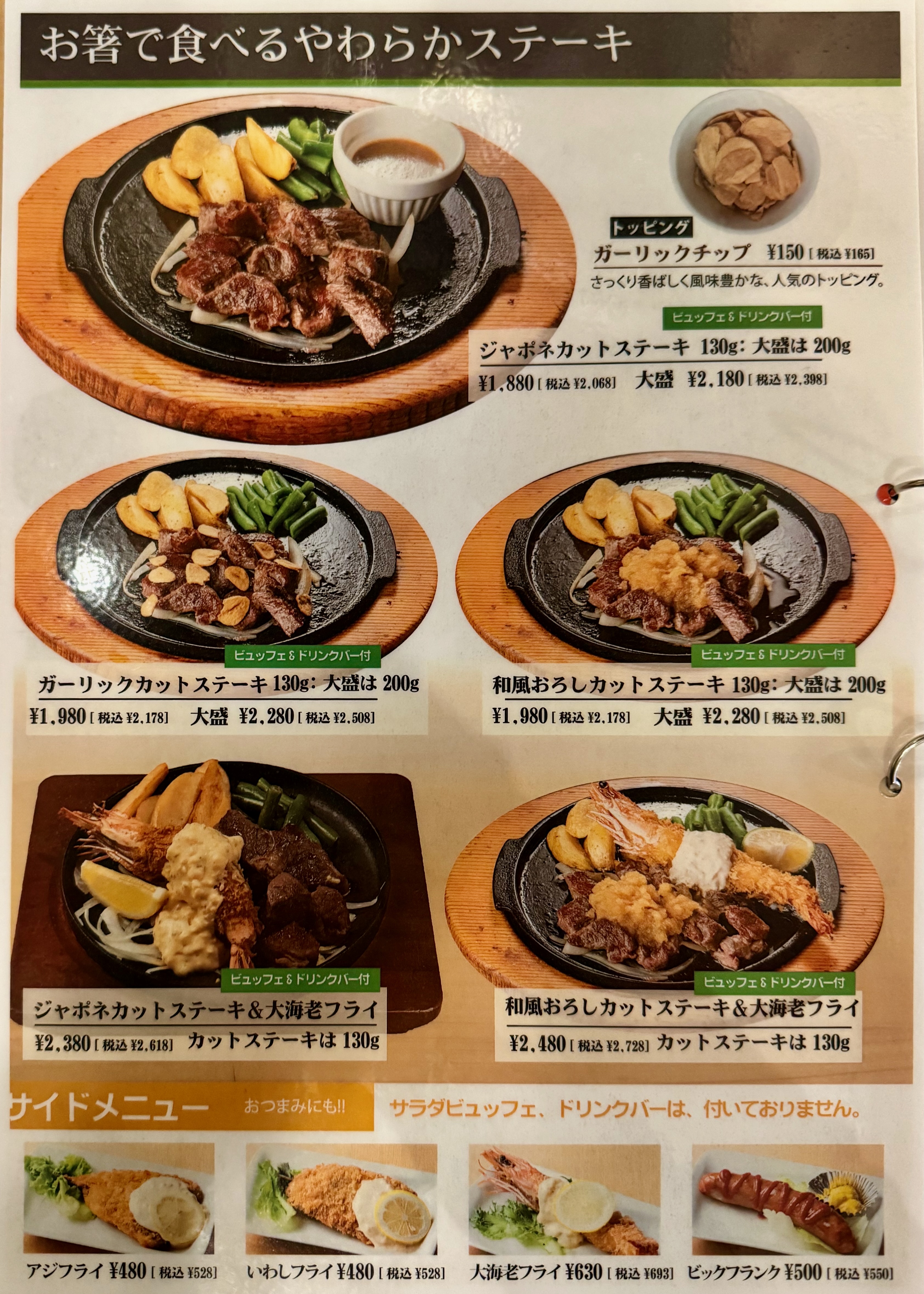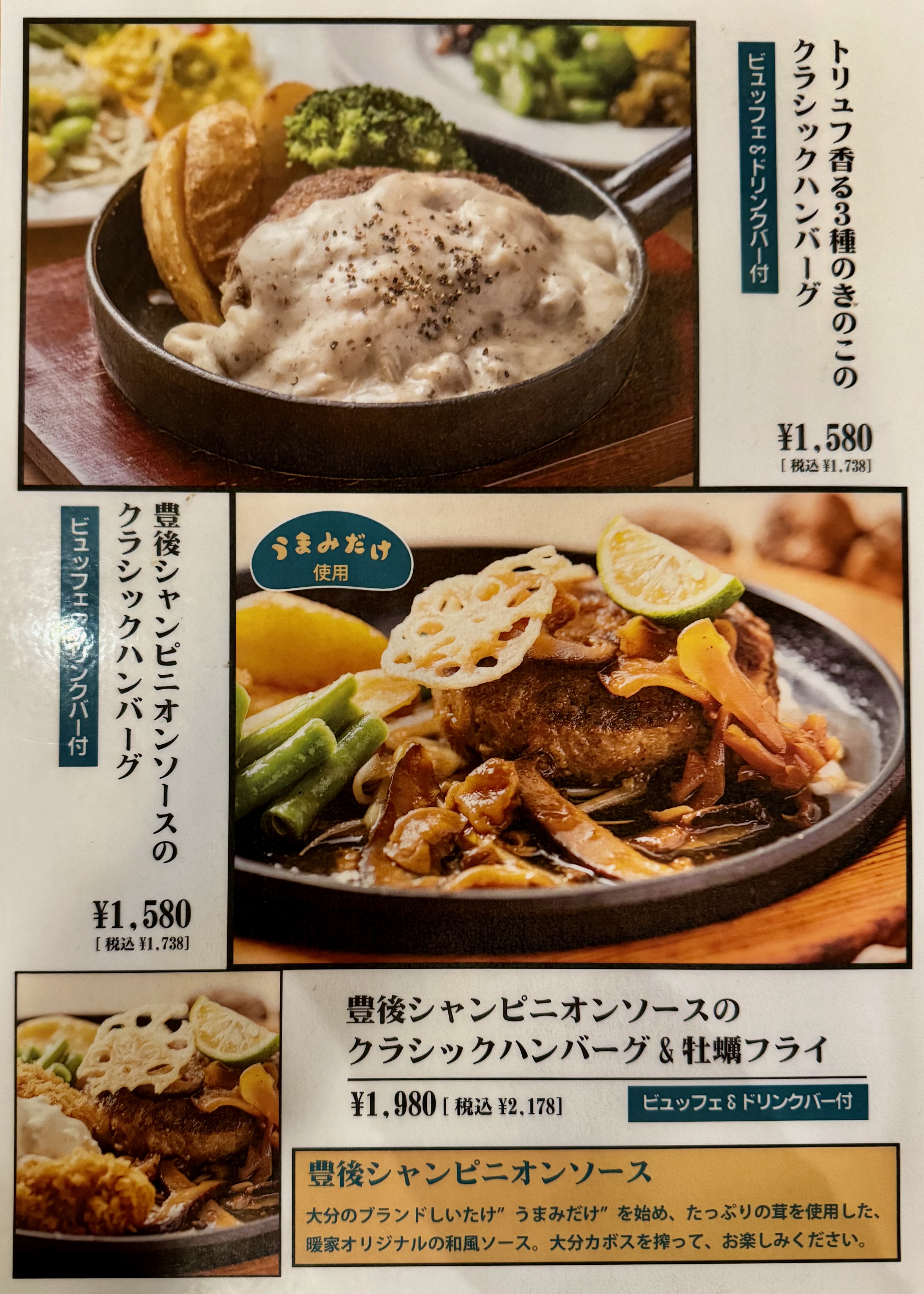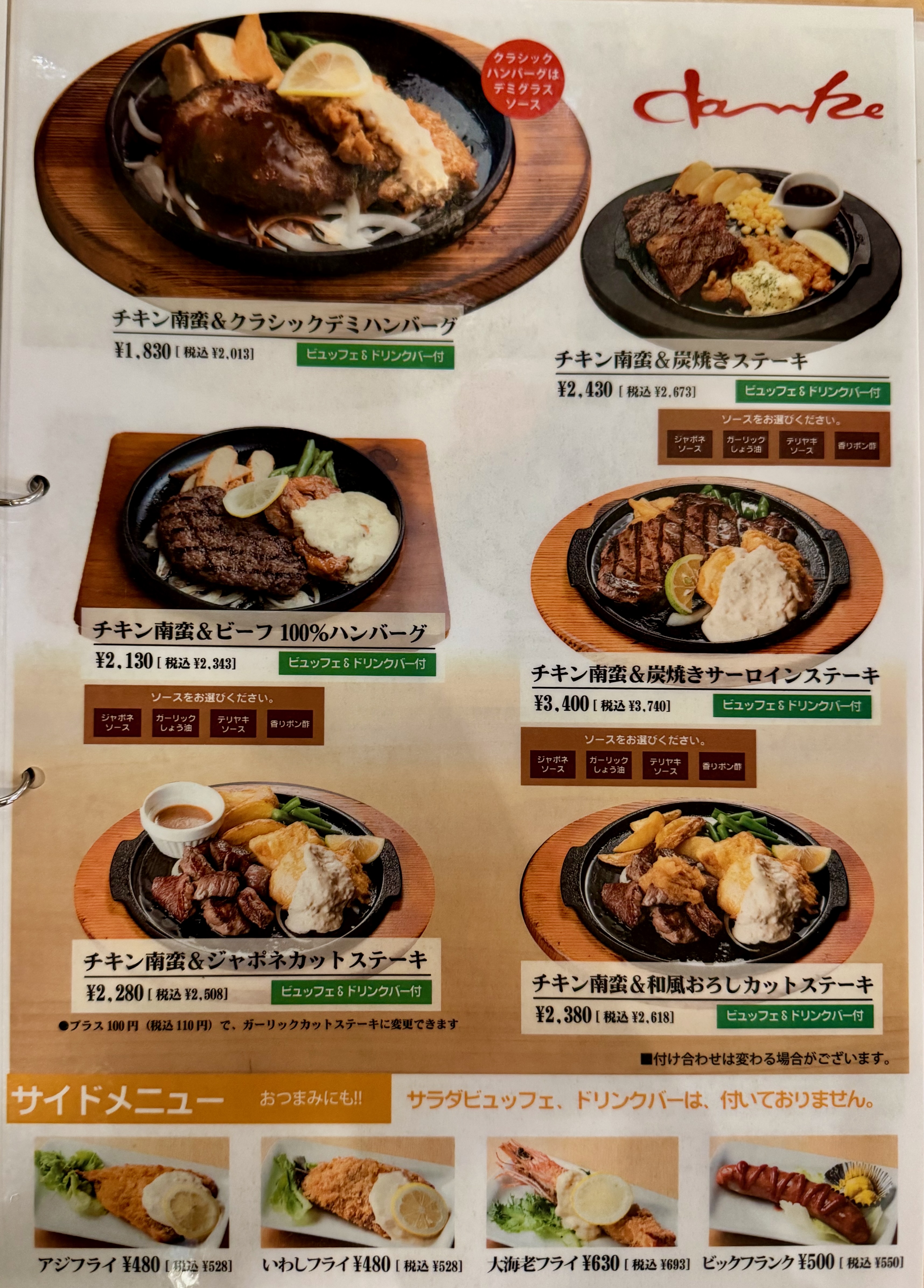 ハンバーグ、ステーキ、チキン南蛮などの洋食系に加え、ビュッフェやドリンクバーを組み合わせて楽しむスタイルが人気です。