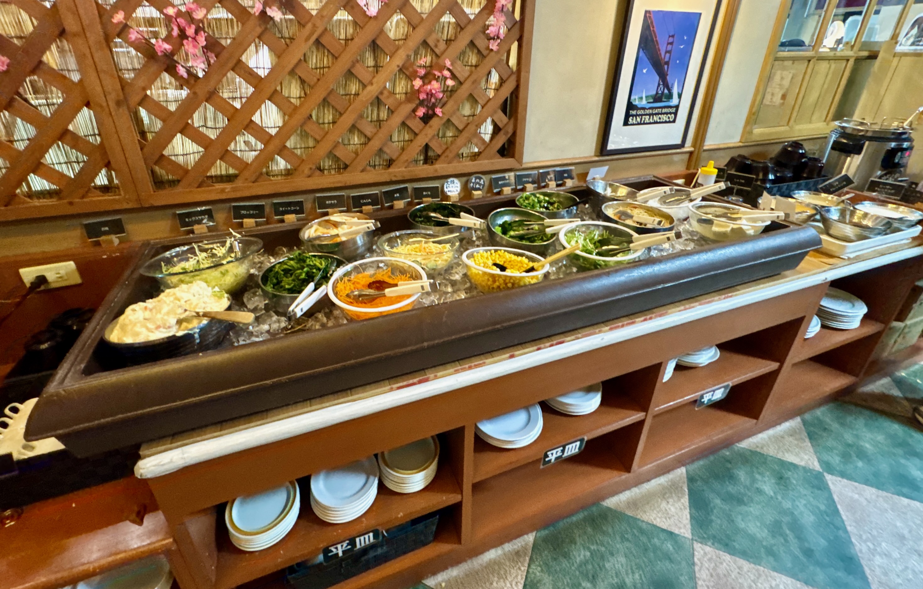 サラダは、キャベツ、タマネギ、ニンジン、ブロッコリー、菜の花、オクラ、サラダパスタ、春雨サラダ、ポテトサラダ、スイートコーンなど、全種類制覇できないほどのラインナップ。