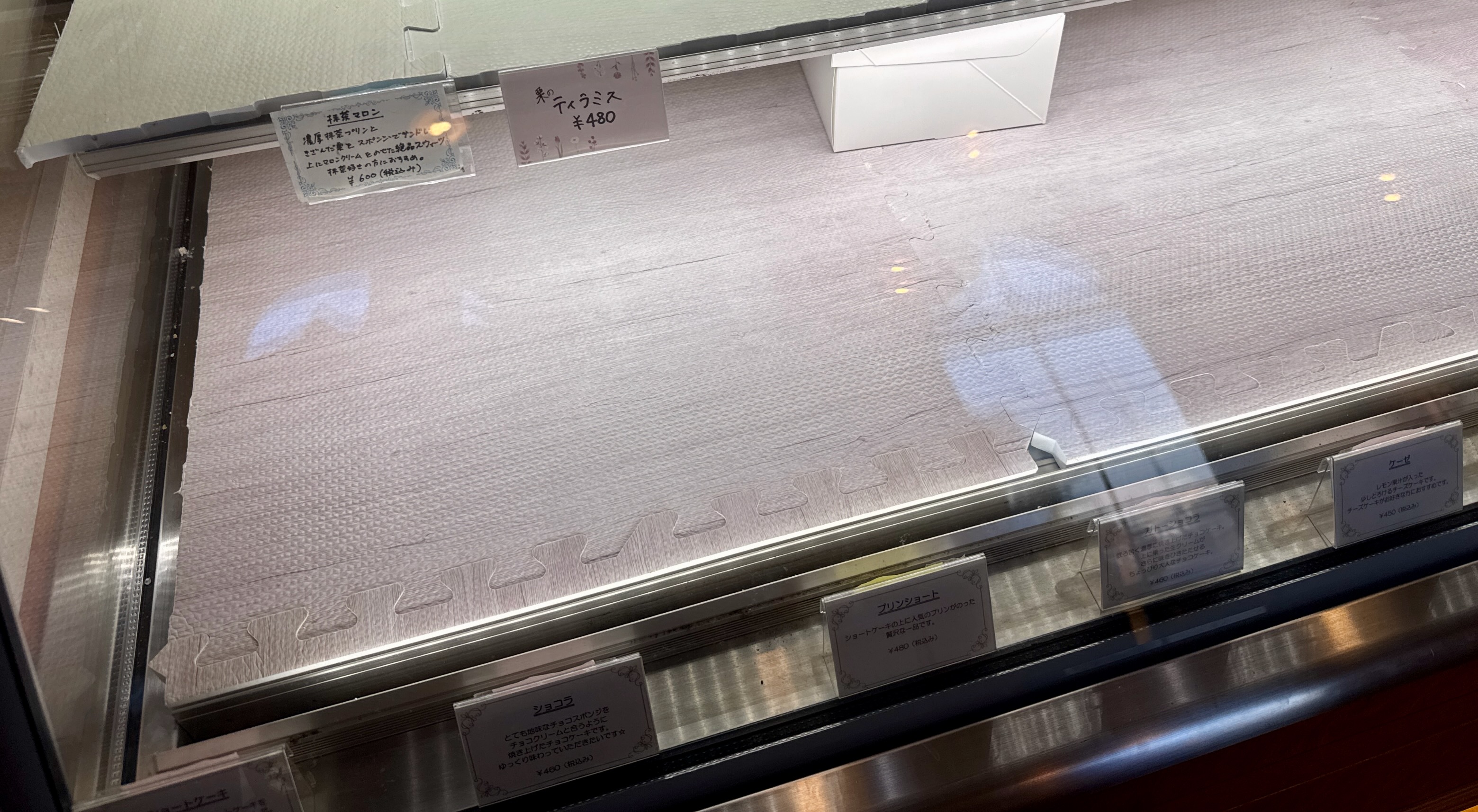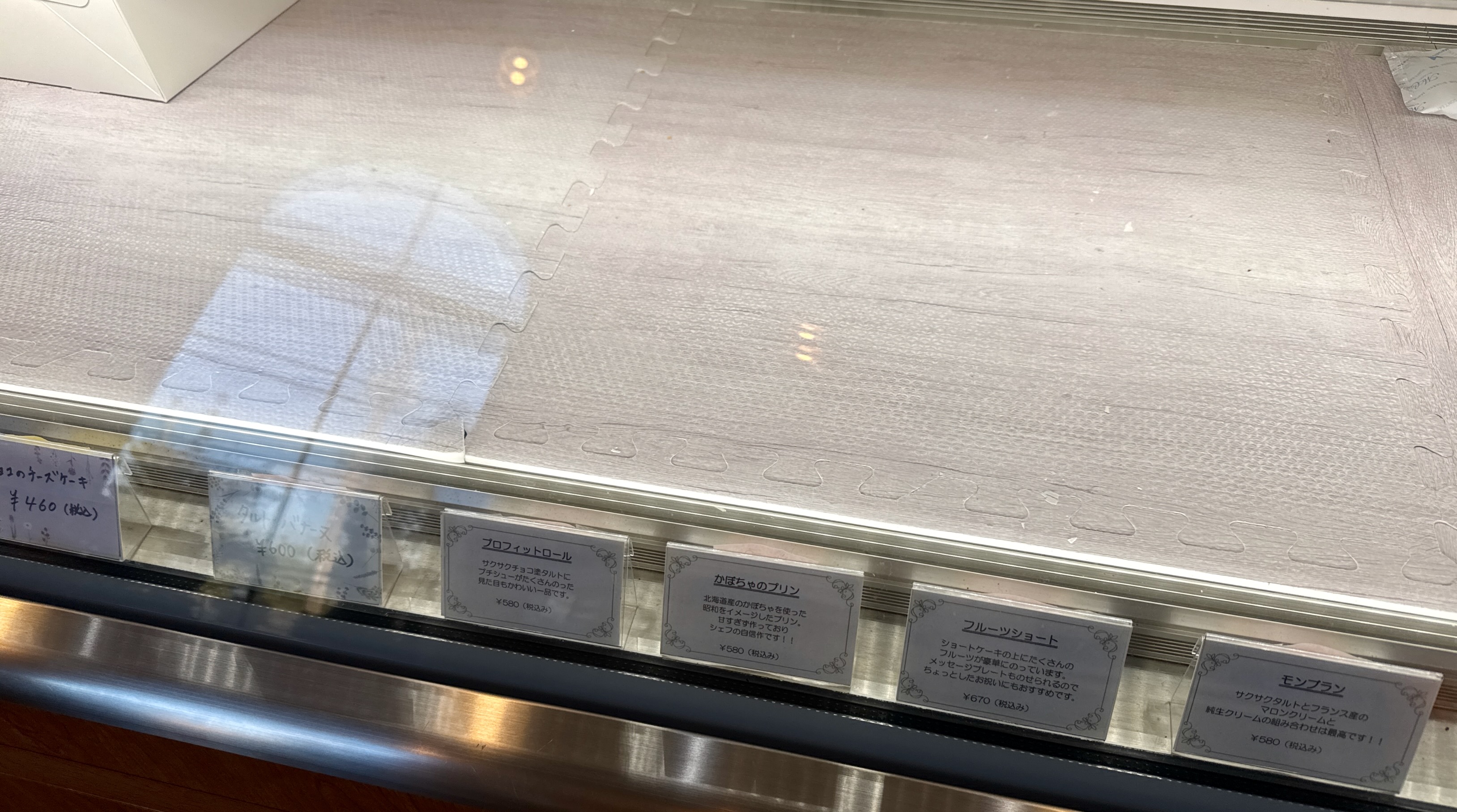 本来であれば、ショーケースには色とりどりのケーキがずらりと並んでいますが、16時頃の訪問だったため、すべて売り切れでした。
