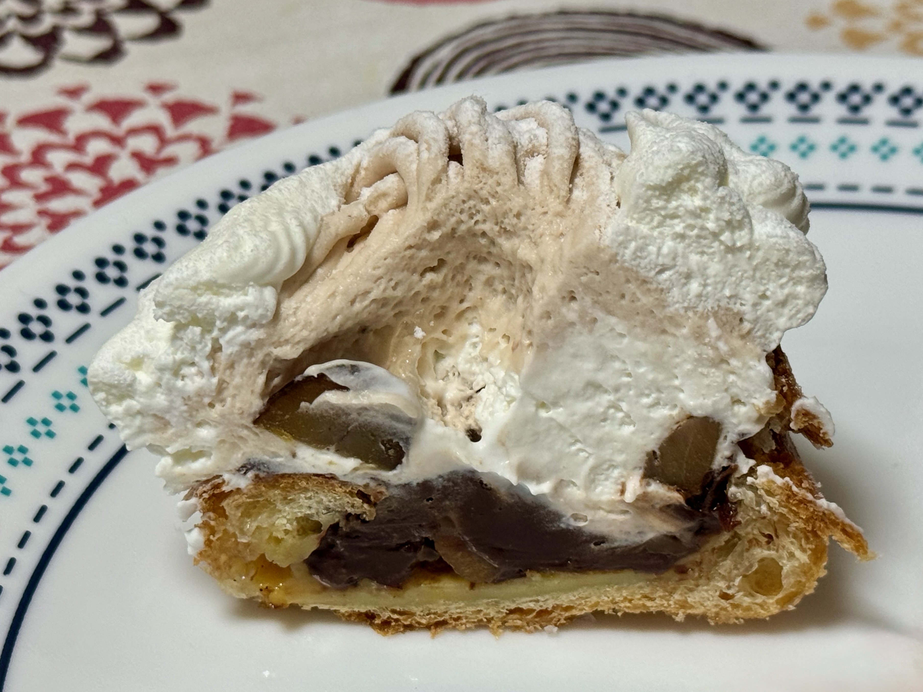 サクサクのパイ生地の上にはマロンクリームとホイップされた生クリームがふんわりと盛られ、その中にはチョコクリームと栗が忍ばされている構成です。