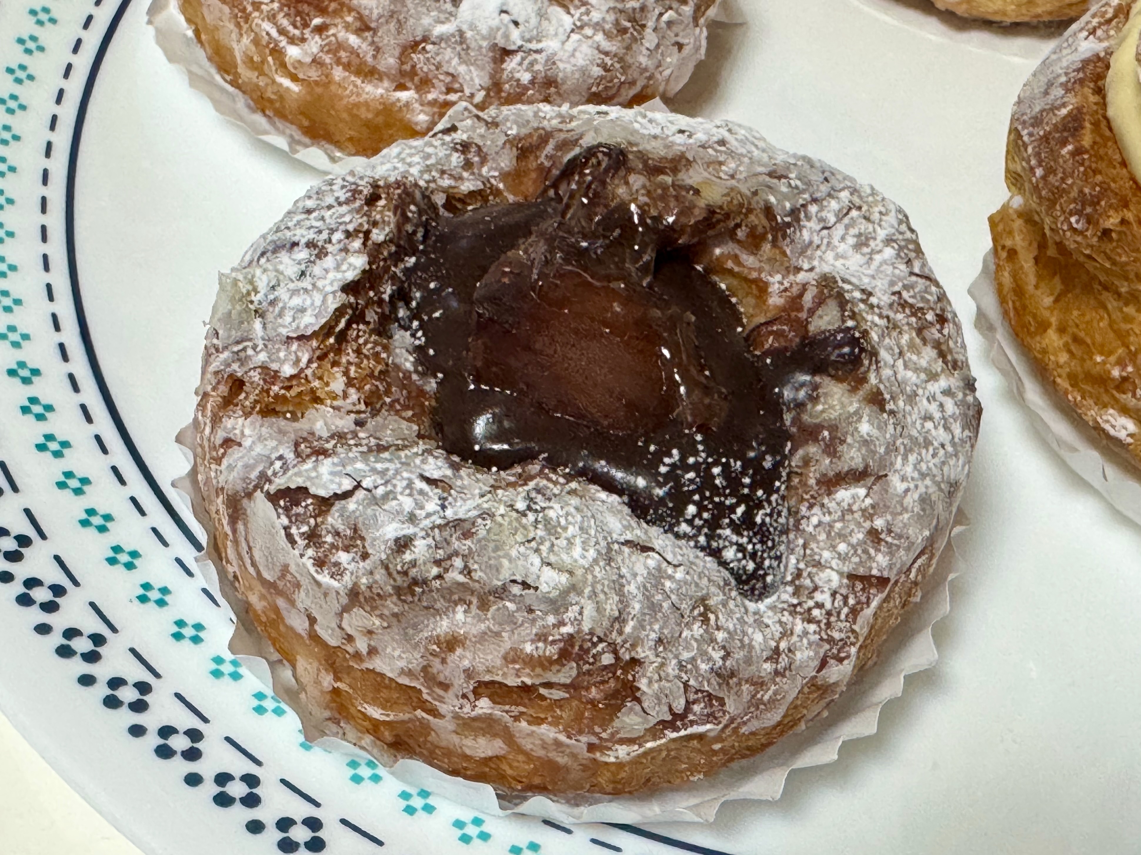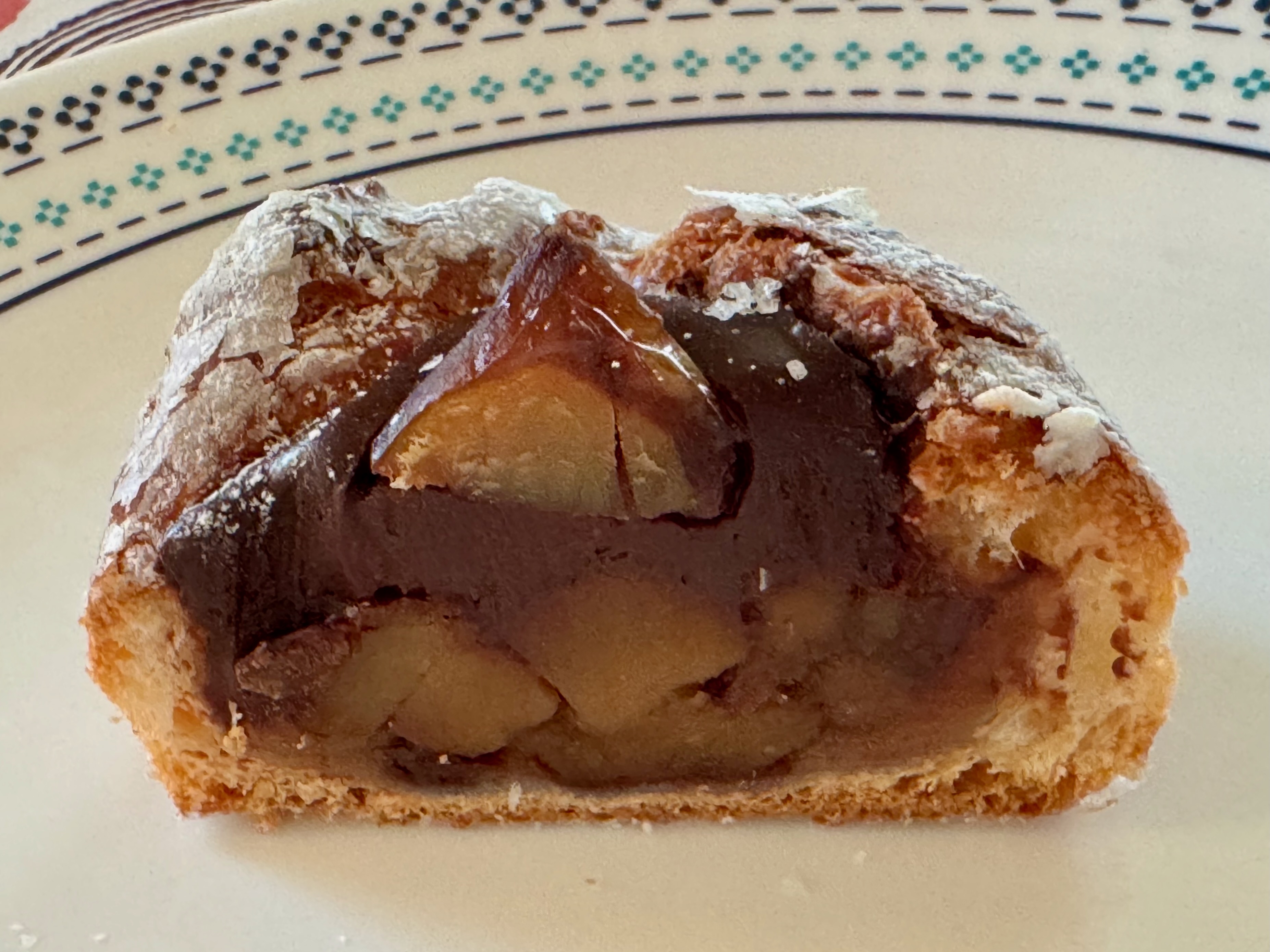 クロワッサン生地のサクサク感と、チョコレートのほろ苦さ、栗のほっくりとした甘さが一体となり、小ぶりながら満足度の高い一品でした。