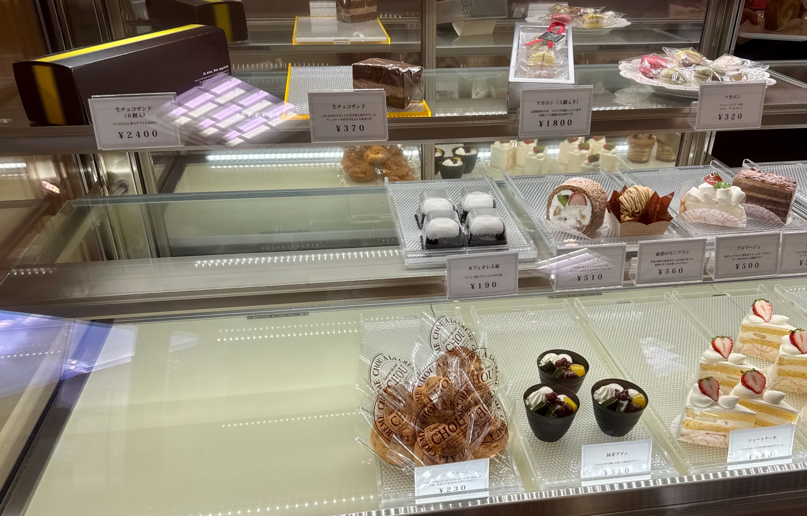 店内は商品を見渡しやすく&回りやすいスッキリとした空間。ショーケースには生ケーキがずらりと並び、反対側には焼き菓子や和菓子が整然と並べられています。