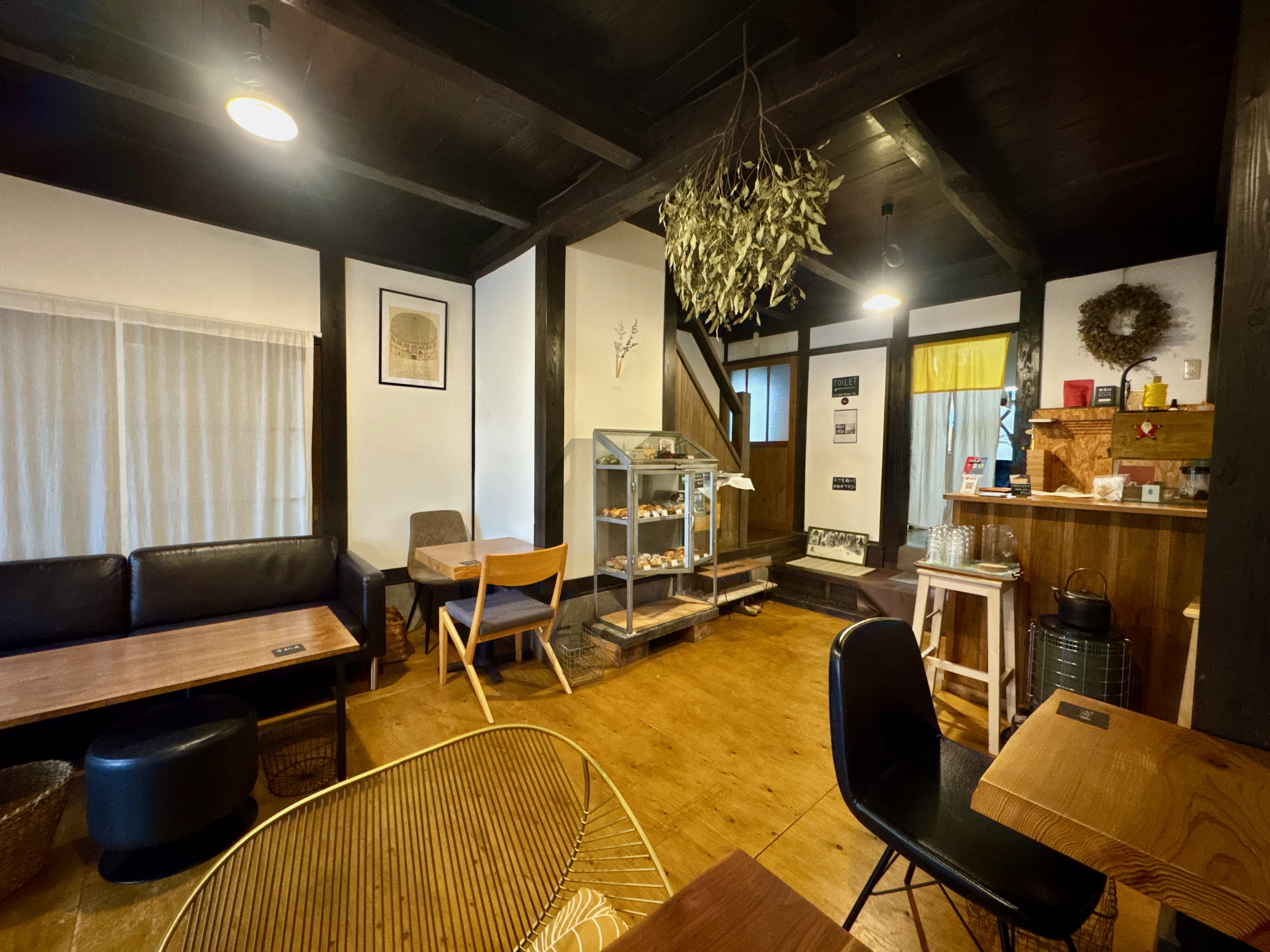 築百年以上の古民家を活かした店内は、梁や柱の質感がそのまま残され、木の温もりを感じる空間です。