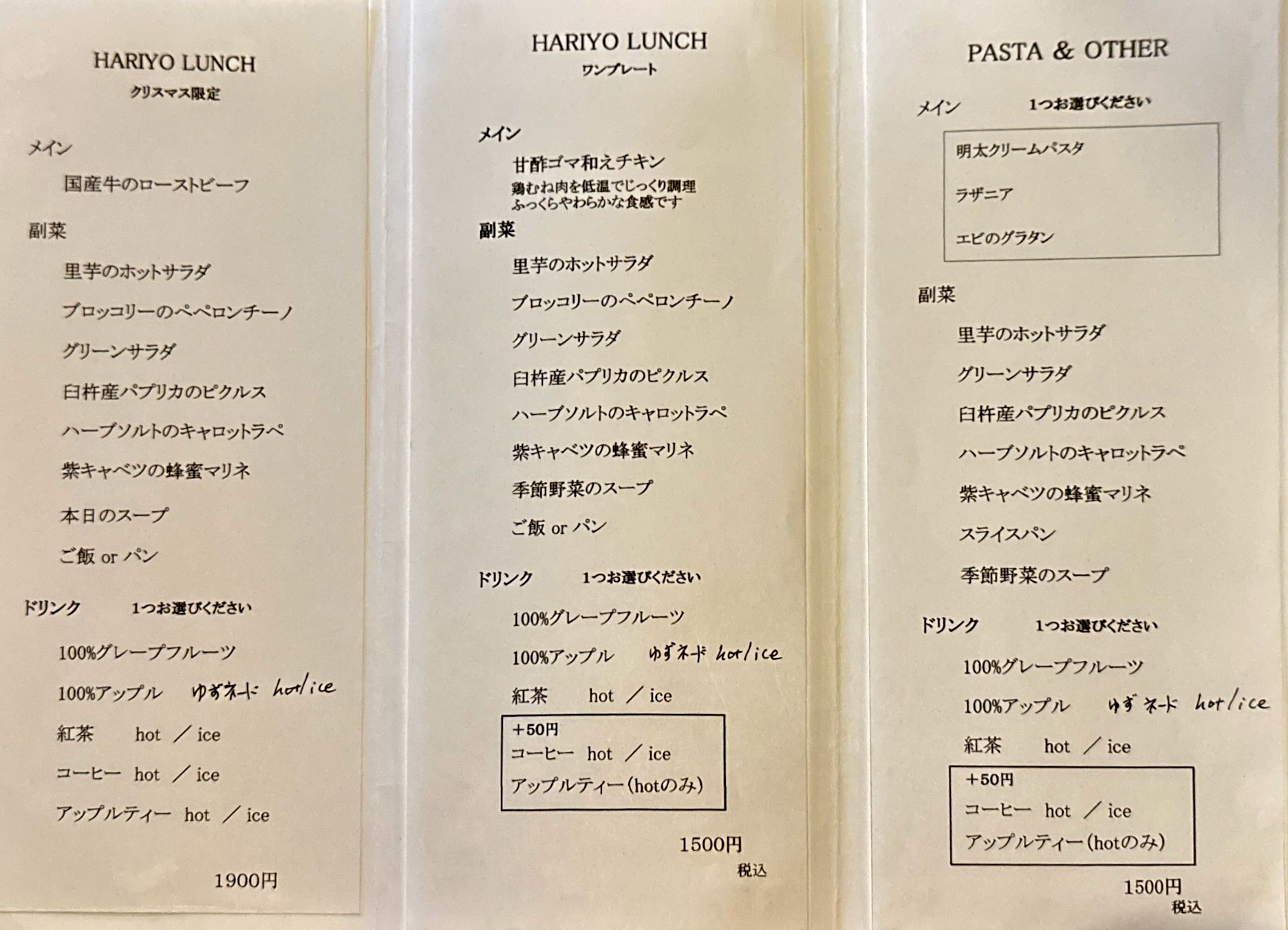 ランチタイムには、自家製パンと季節のスープ、メイン、副菜が盛り込まれたワンプレートスタイルの「HARIYOランチ」が提供されています。メインの料理は週替りで変わります。