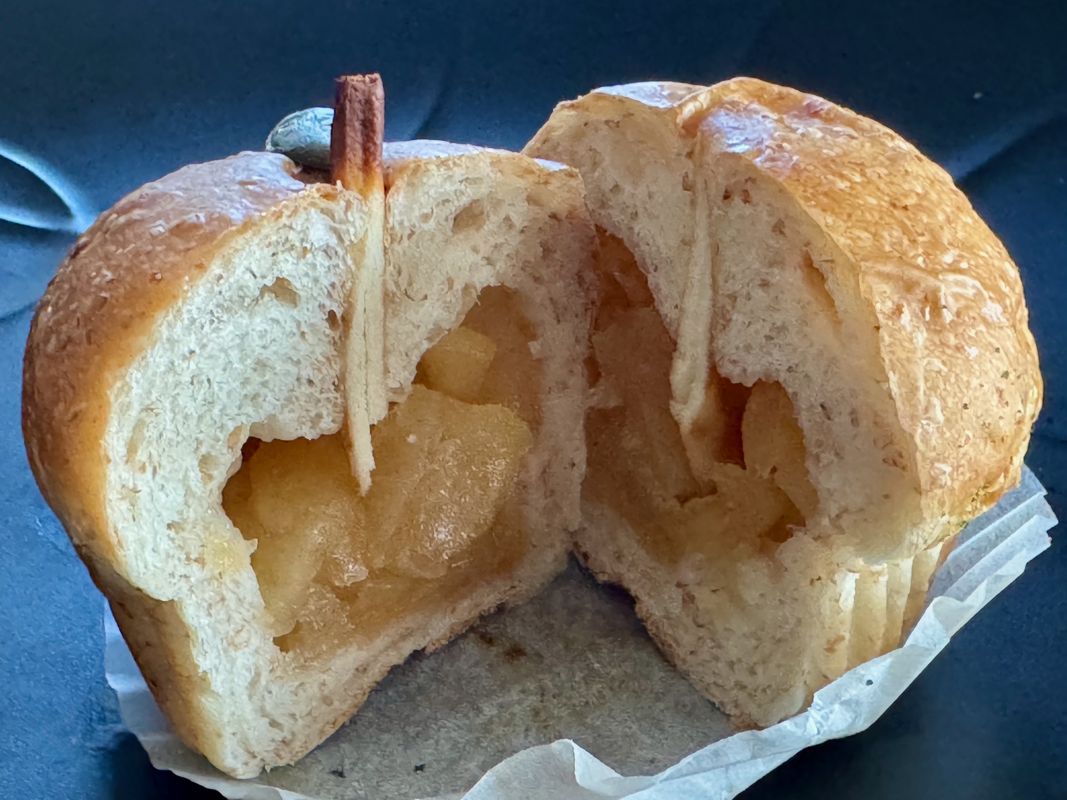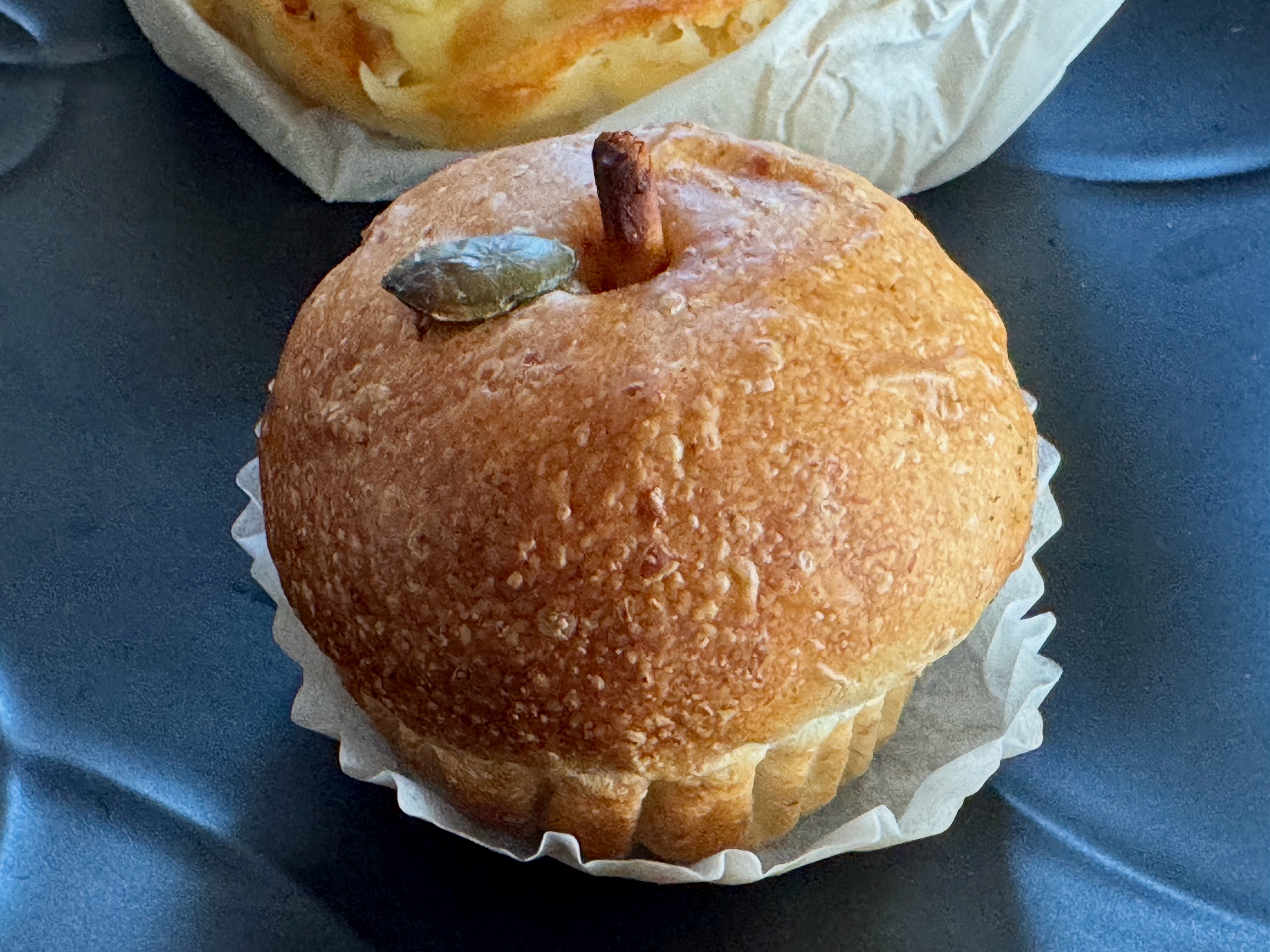 りんごパンは、りんごの形をした可愛らしいフォルムで、中にはりんごのコンポートが入ったデザート感覚のパンです。