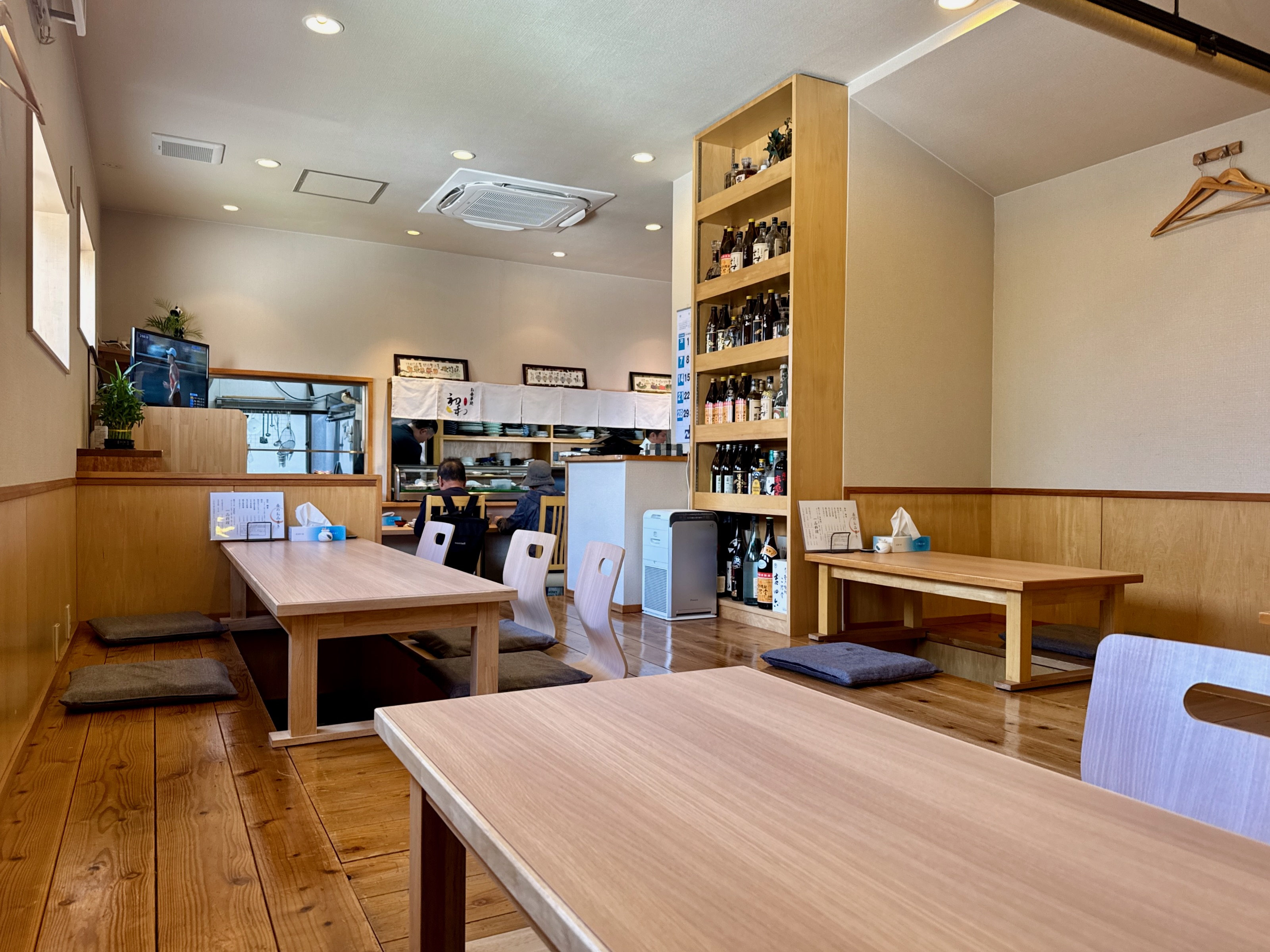 店内は、落ち着いた照明と木目調の内装で、お酒と肴でしっぽり一人飲みにもぴったりの和の空間です。