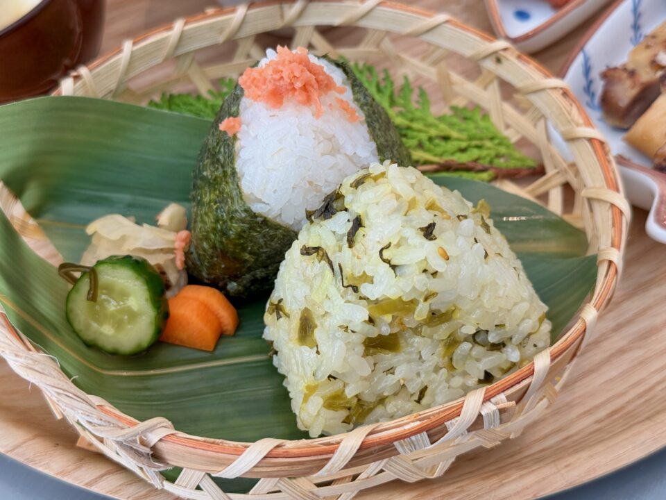 おにぎりは鮭・昆布・梅・高菜から2種類を選べますが、今回は鮭と高菜をチョイス!三角形のおにぎりの姿が、まず視覚からほっとさせてくれます。