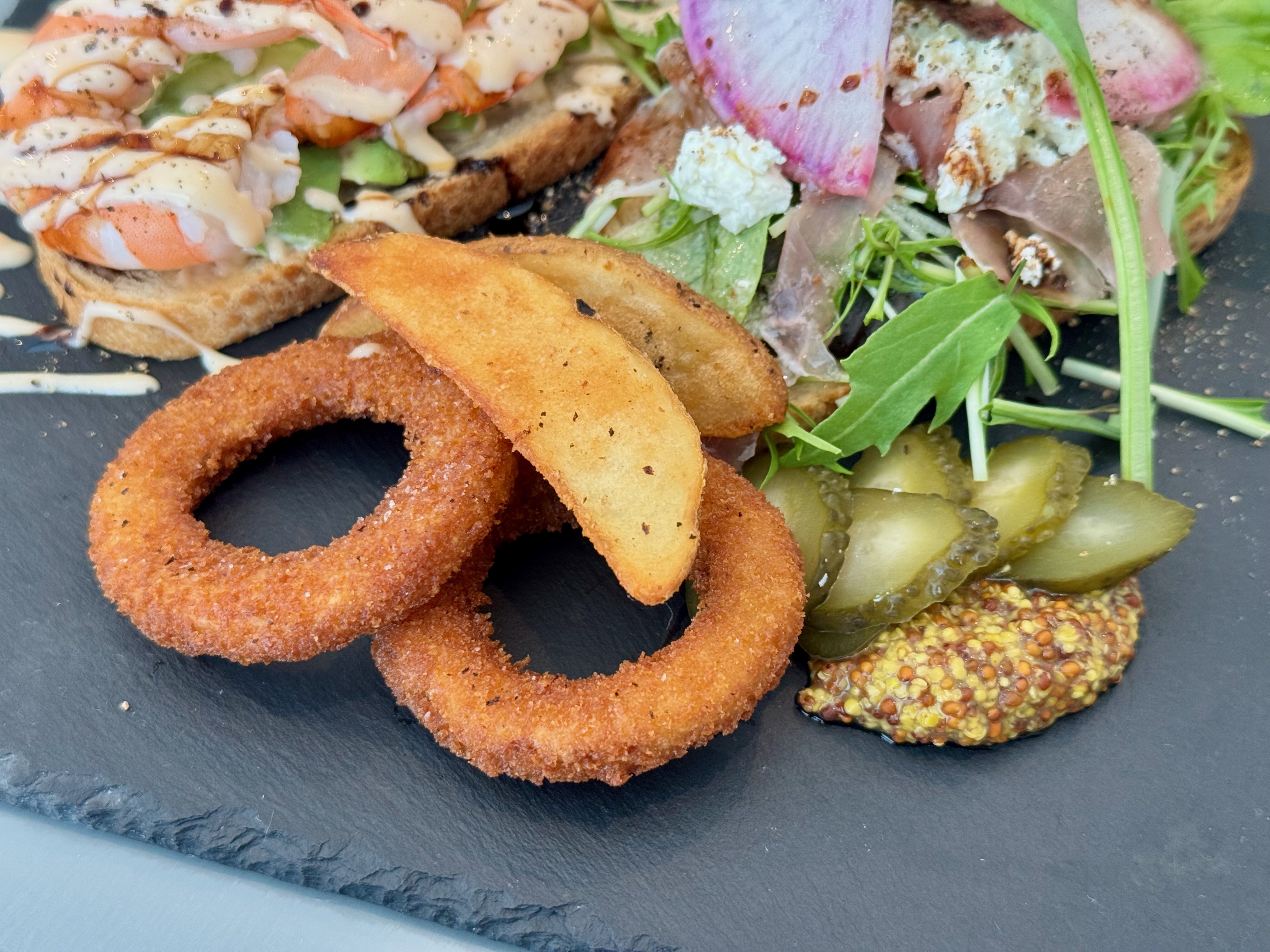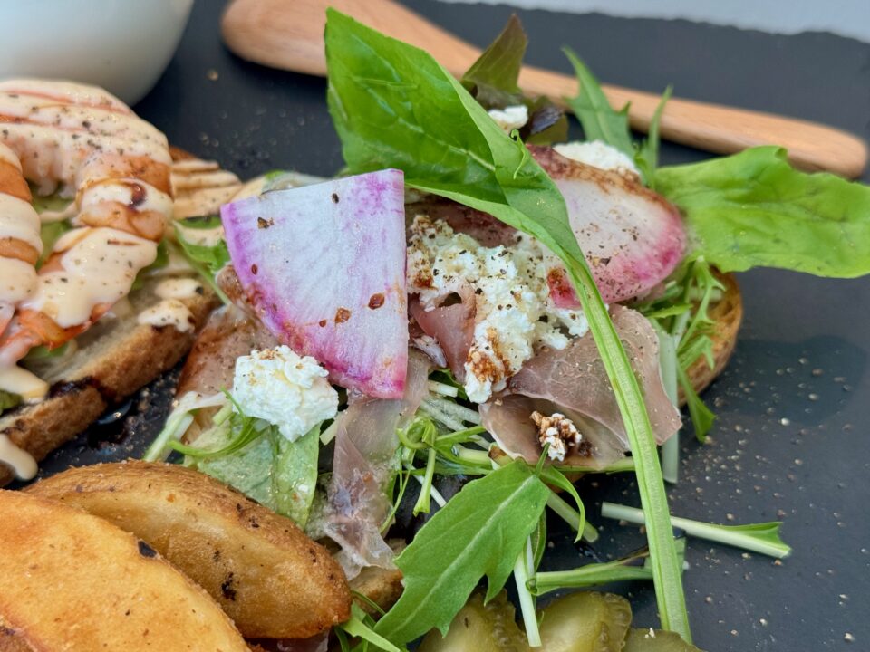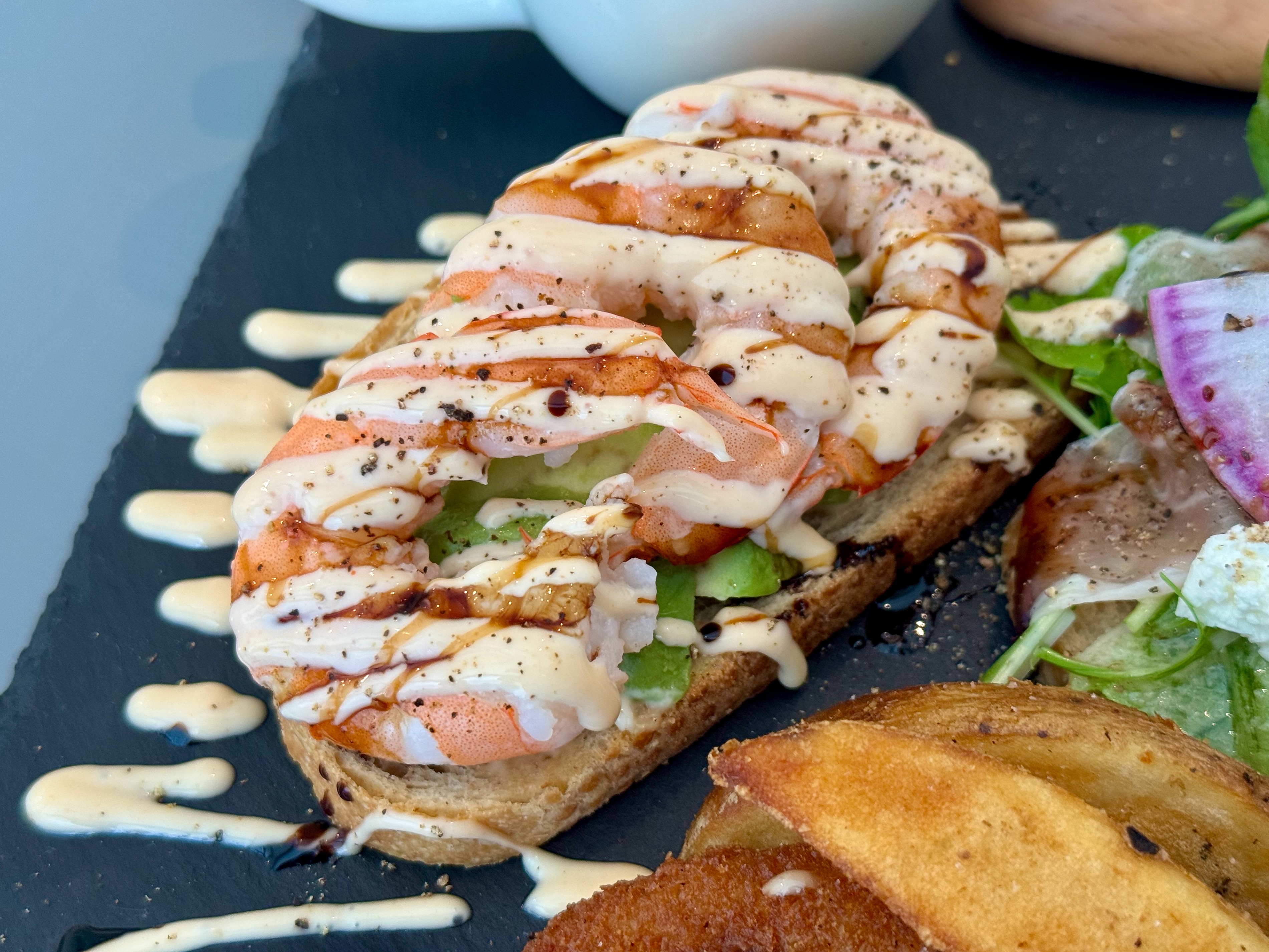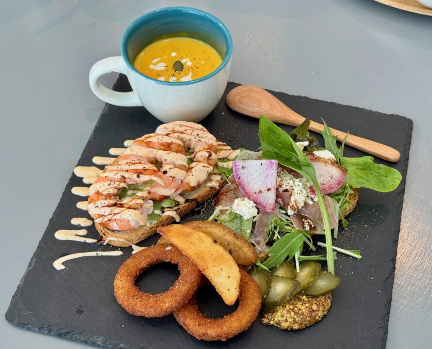 カリッと焼かれたパンの香ばしさと、アボカドの滑らかさ、海老の歯ごたえが同時に押し寄せてきて、一口ごとに食感のレイヤーが重なるような楽しさがありました。