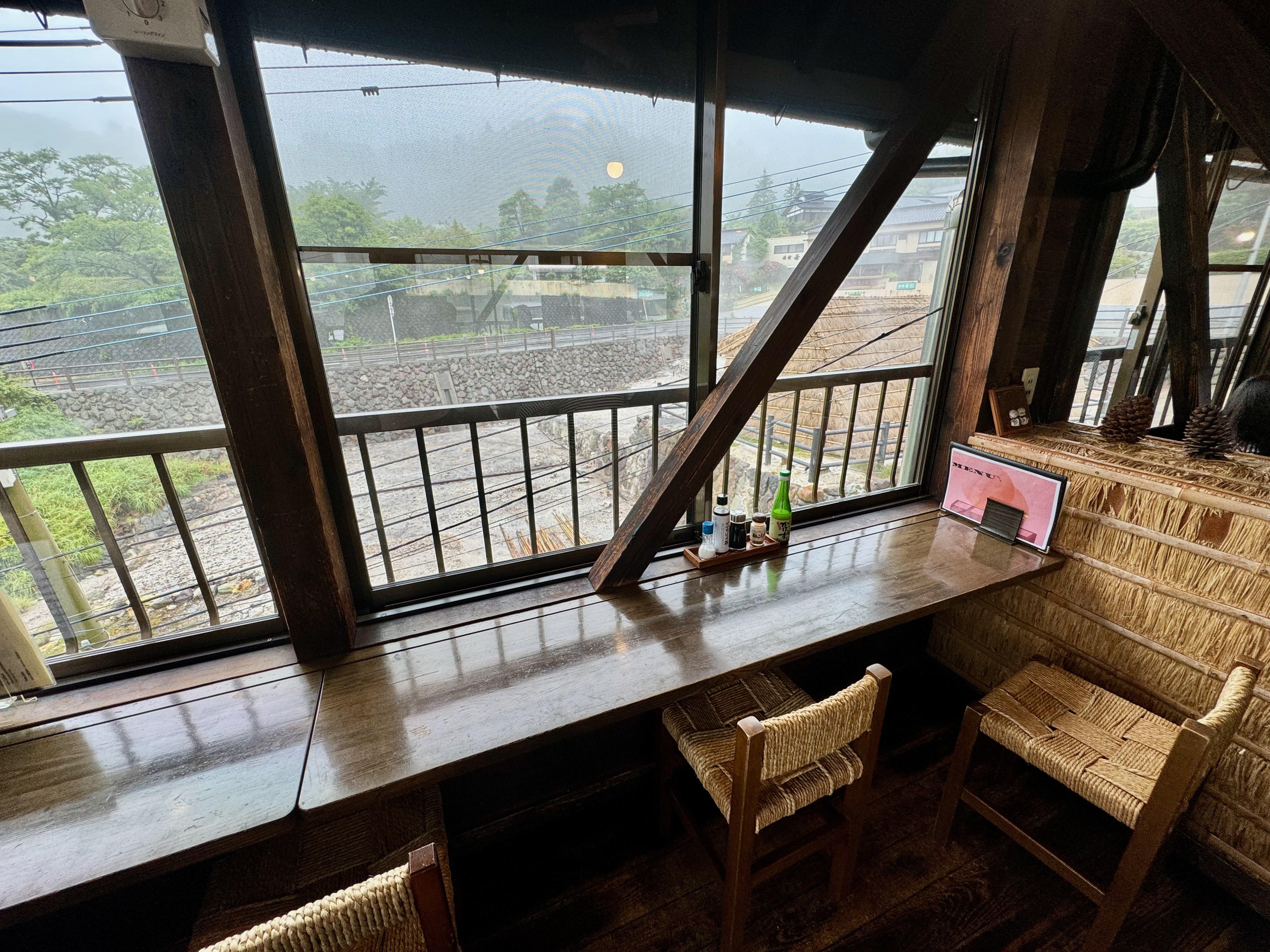 窓際の席では、立ち上がる湯煙や湯の花小屋を眺めながらくつろぎの時間を過ごせます。