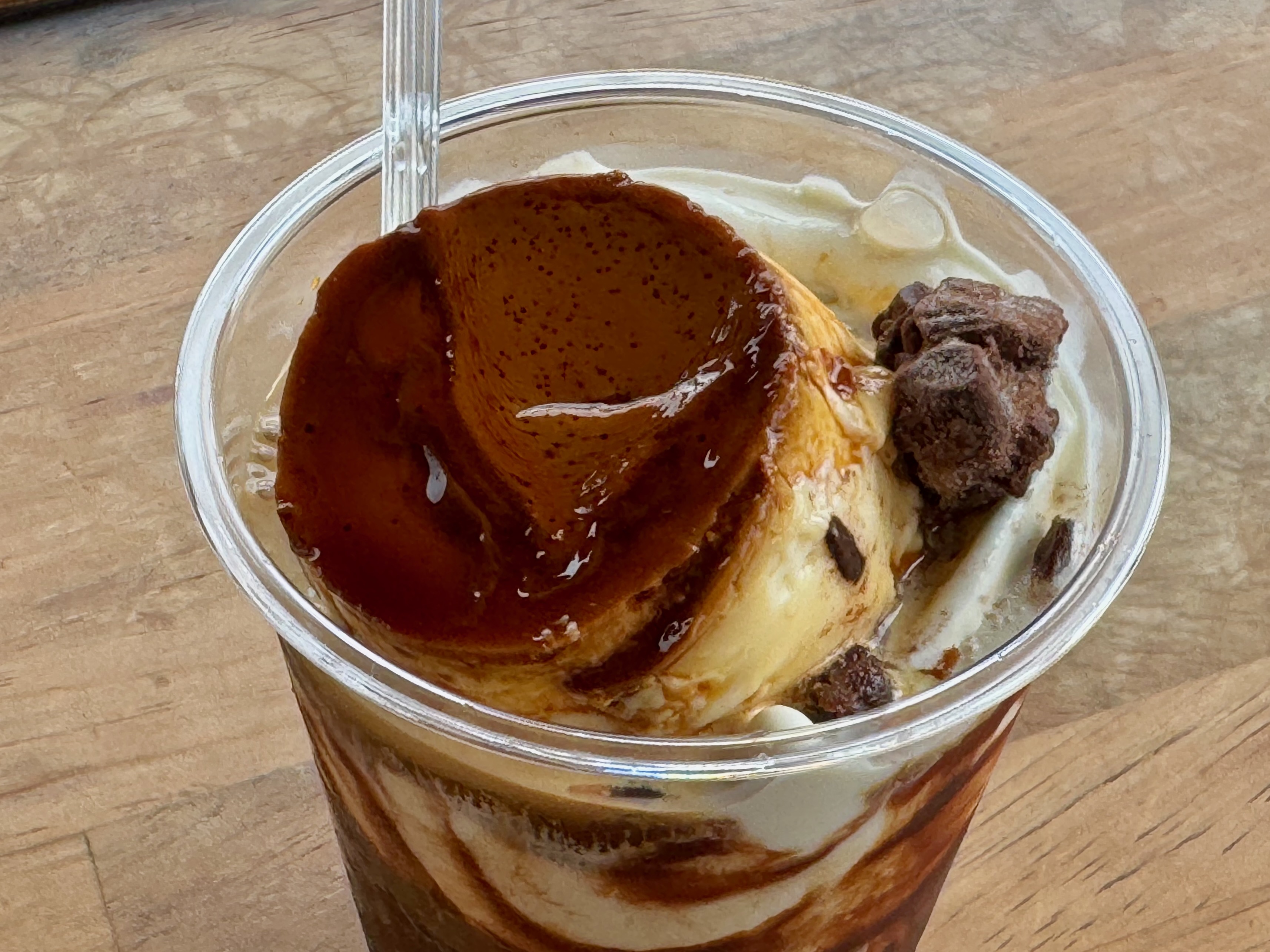 パフェには名物の地獄蒸しプリンが丸ごと入っていて、ソフトクリームとコーンフレークが層をなします。