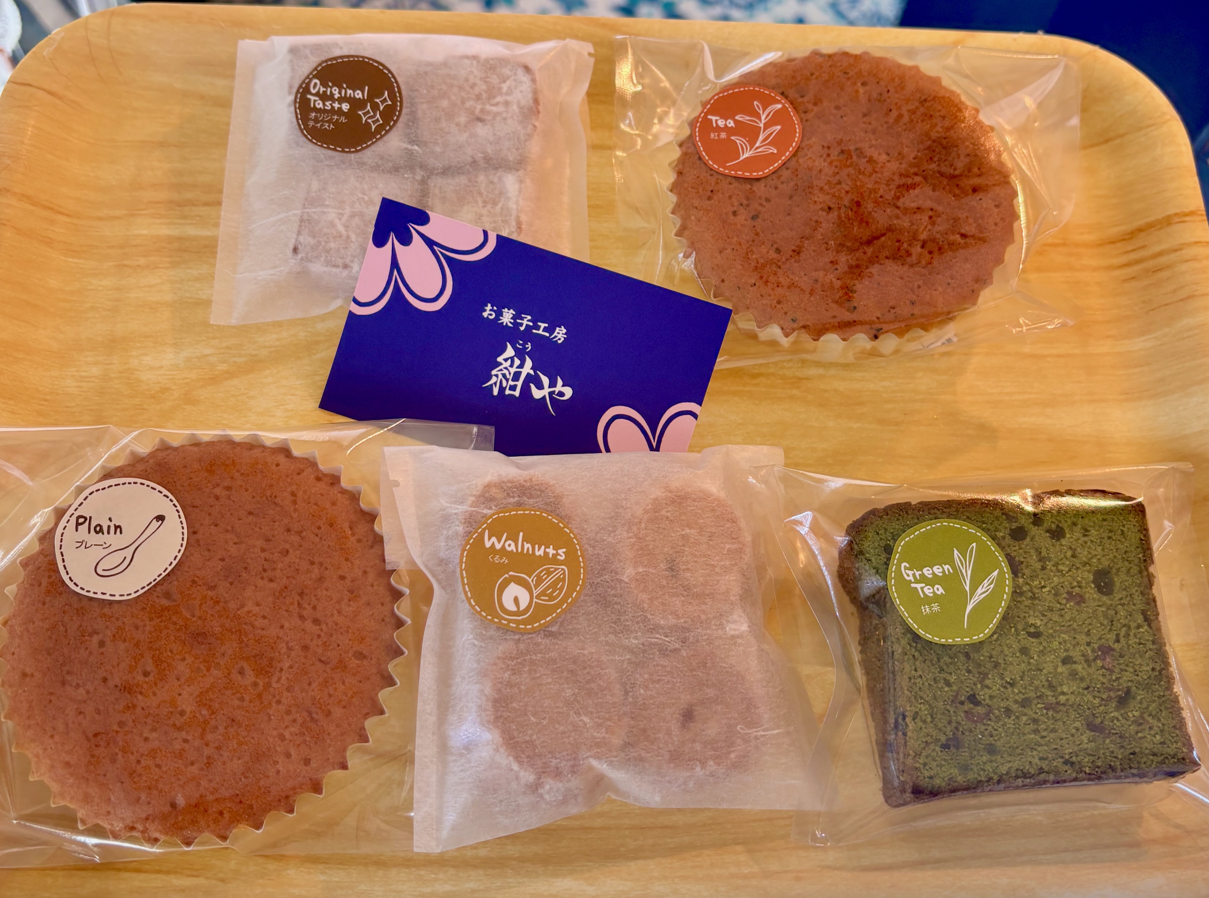 左上から時計回りに、餅っ子クッキー(250円)、紅茶マドレーヌ(200円)、抹茶パウンドケーキ(250円)、くるみクッキー(220円)、紺やマドレーヌ(200円)