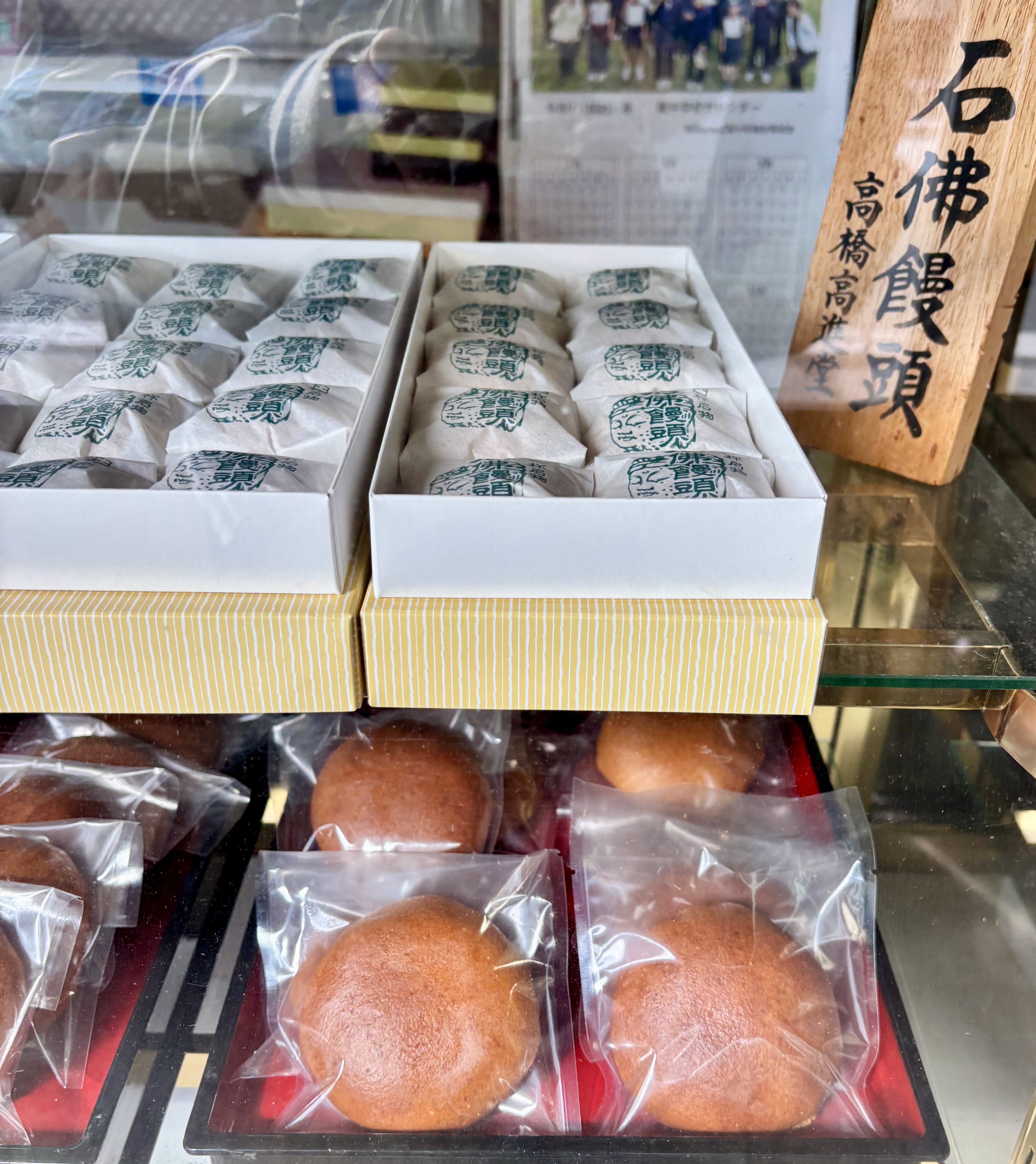 「石仏饅頭」はザラメの食感と素朴な甘さが魅力で、「焼き饅頭」は香ばしい生地と白餡のやさしいハーモニーが楽しめる、どちらも “日常に寄り添うおやつ” です。