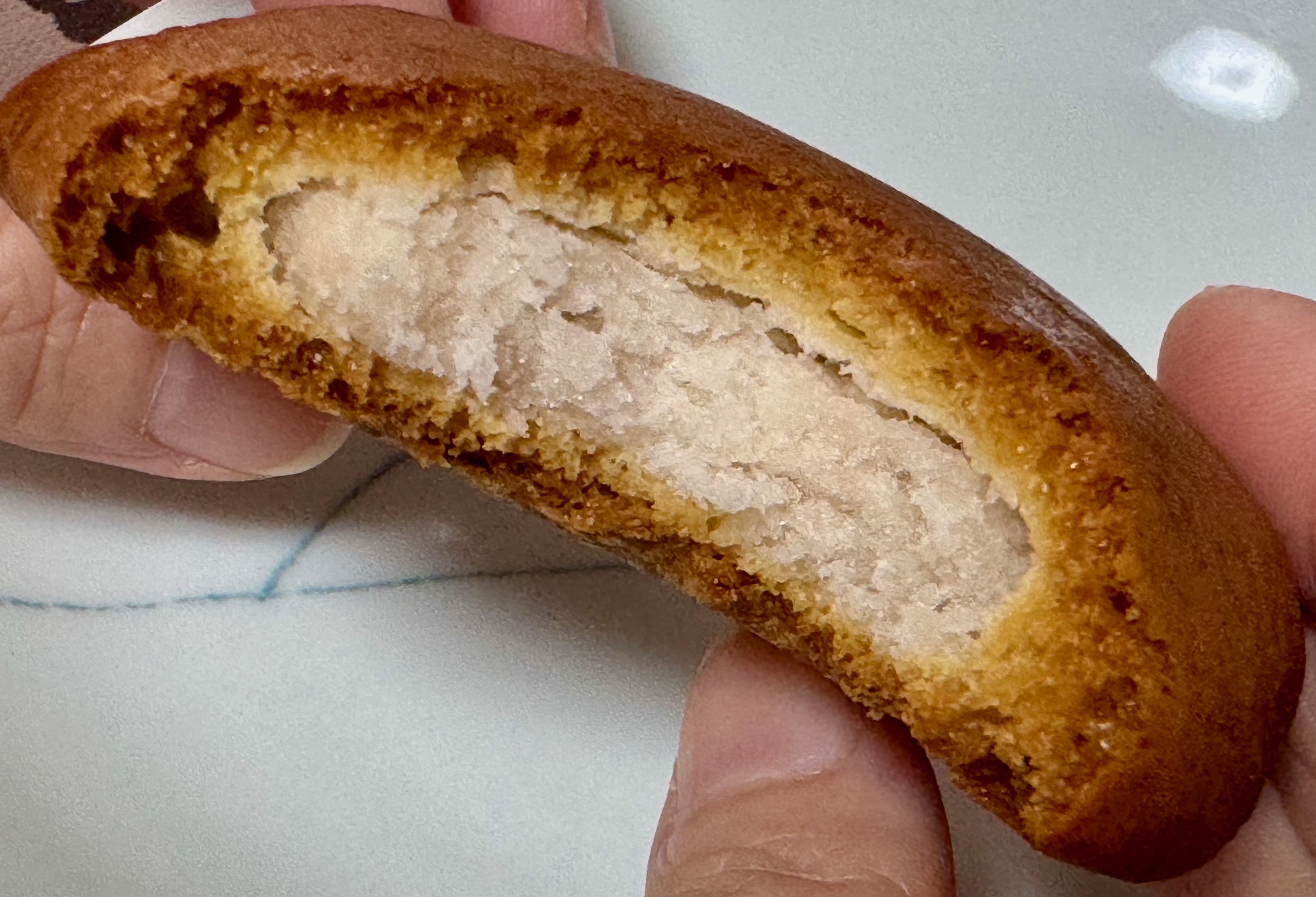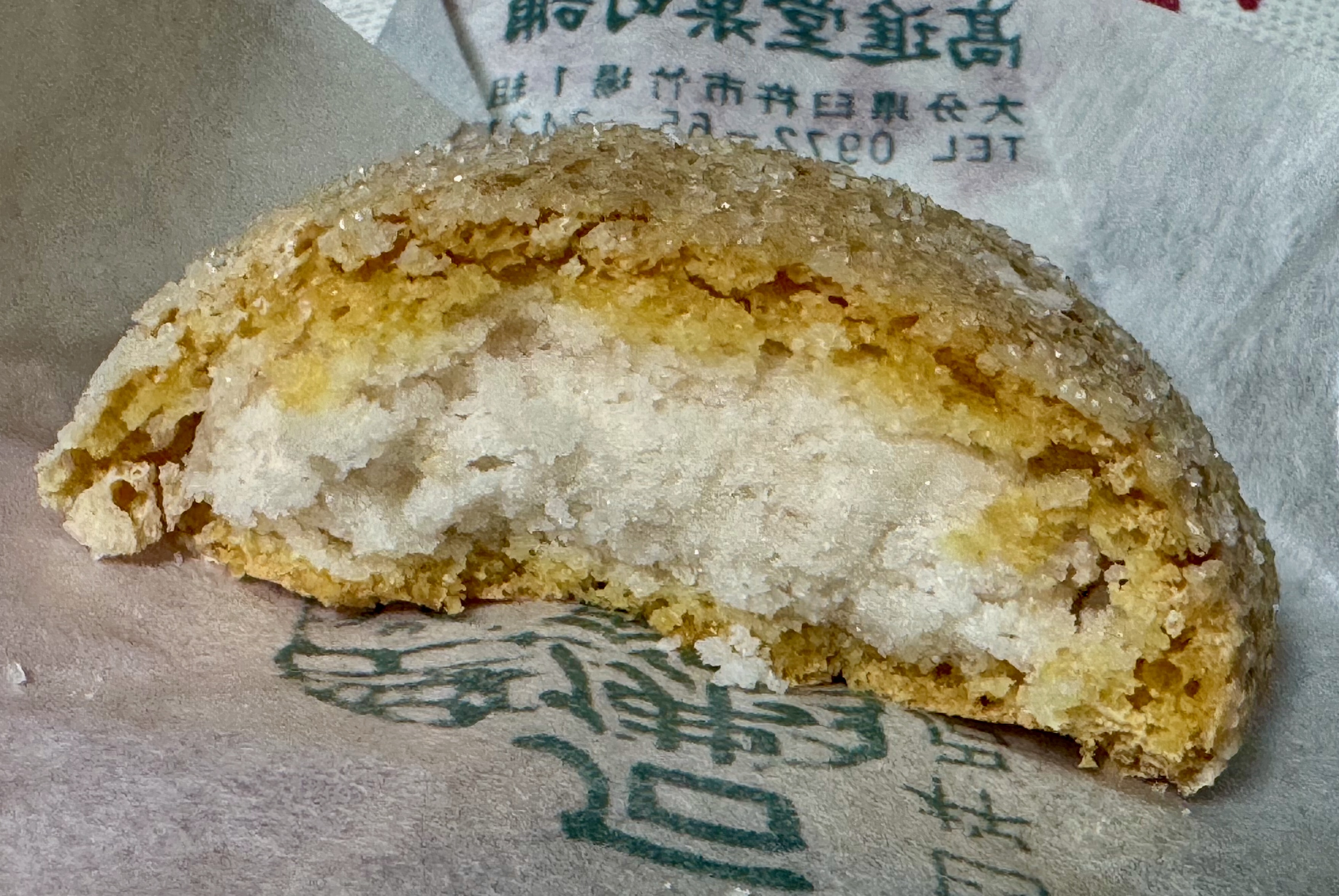 一口かじると、まず最初にやってくるのはザラメのシャリッとした歯ざわりで、そのあとに生地のややしっかりとした噛み応えが続きます。中の白餡は甘さ控えめというより、「きちんと甘いけれど、しつこく残らない」という絶妙なラインです。