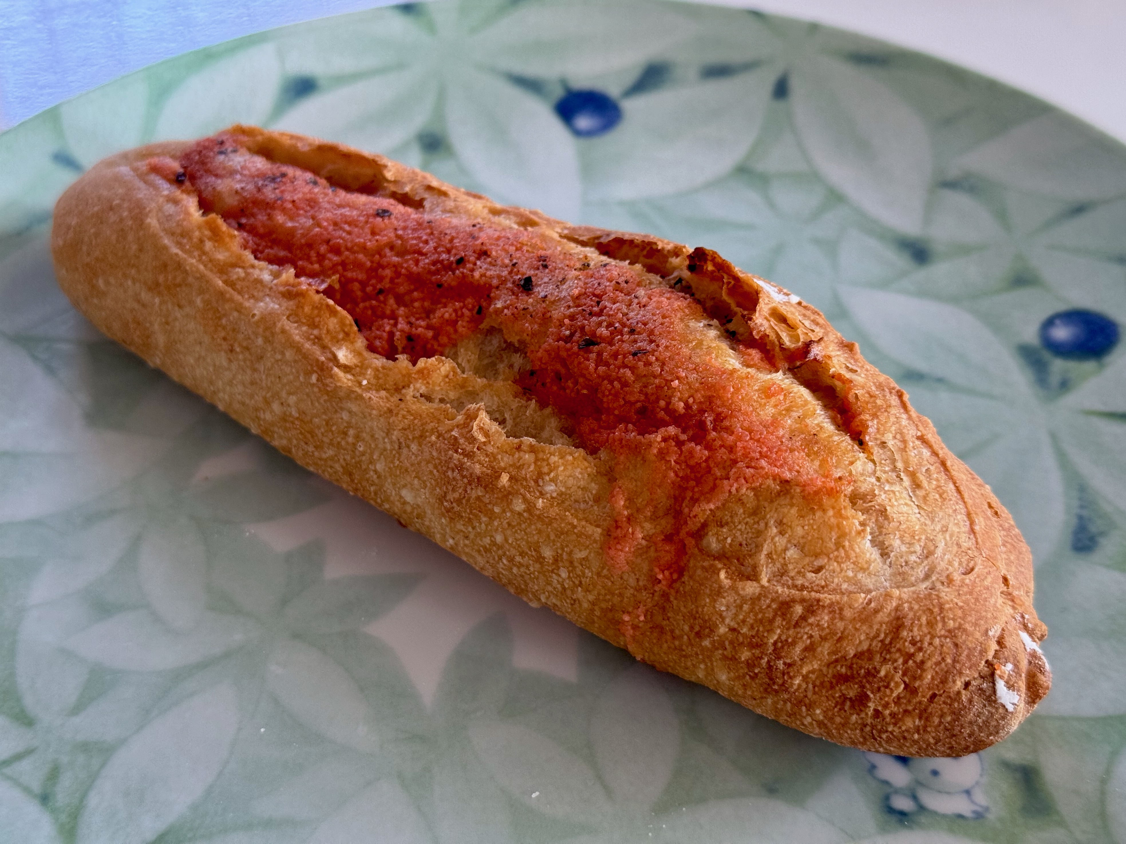 クラストはパリッと軽快に割れ、クラムはふわもち系で、そこに明太バターの塩気と旨味がじゅわっと染み込み、ひと口ごとに「もう一口」と欲しくなる中毒性があります。