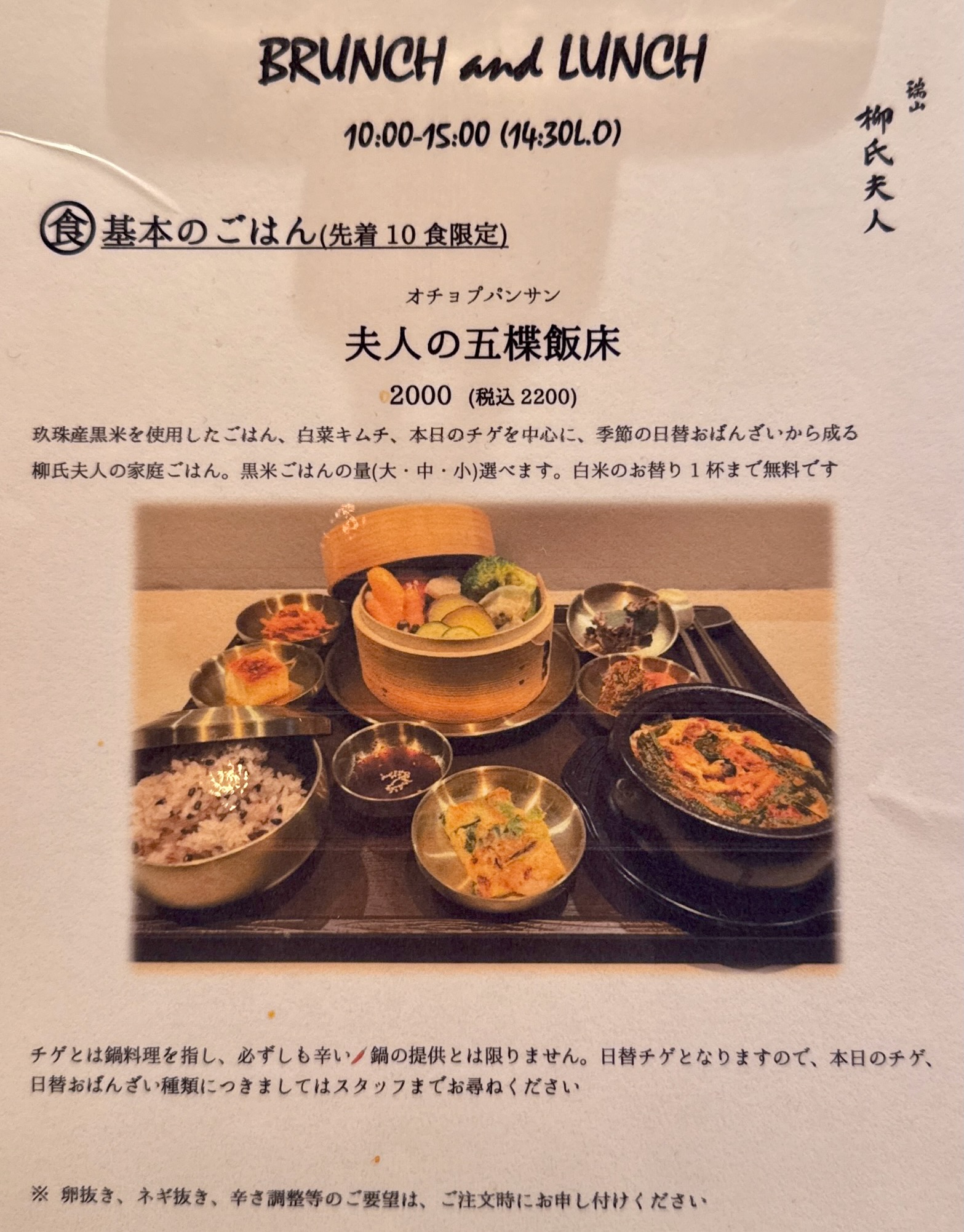 玖珠産黒米を使用したごはん、白菜キムチ、本日のチゲを中心に、季節の日替おばんざいからなる柳氏夫人の家庭ごはん「夫人の五楪飯床(オチョプパンサン)」。先着10食限定の大人気メニューです。