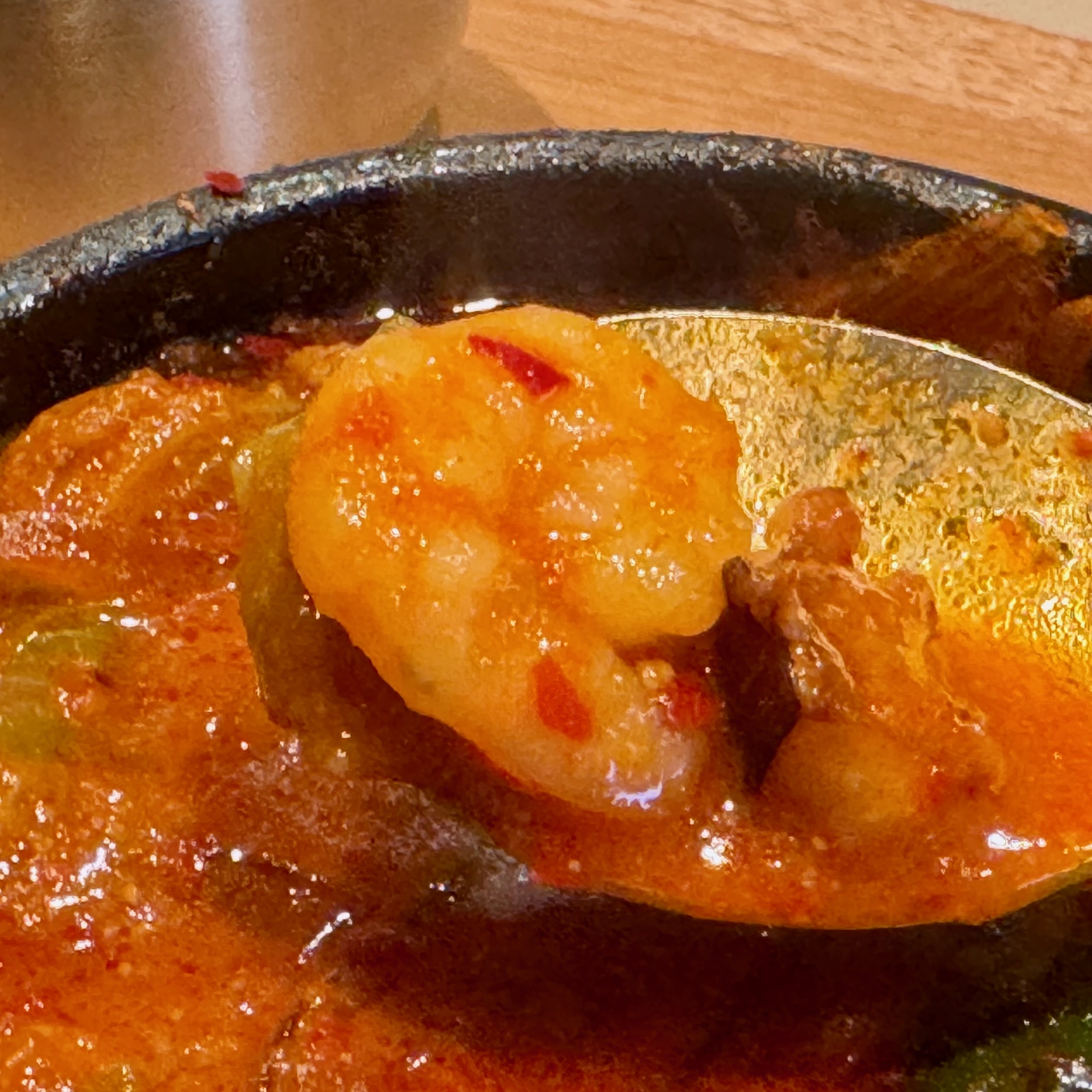 タコはぷりっと弾力、ホルモンは適度な脂の甘みがスープと溶け合い、エビは出汁要員と主役の両方をこなすいい仕事ぶりです。 辛さは“旨辛”の名にふさわしく、辛いもの好きなら汗をかきながらも笑顔で食べられるレベルです。