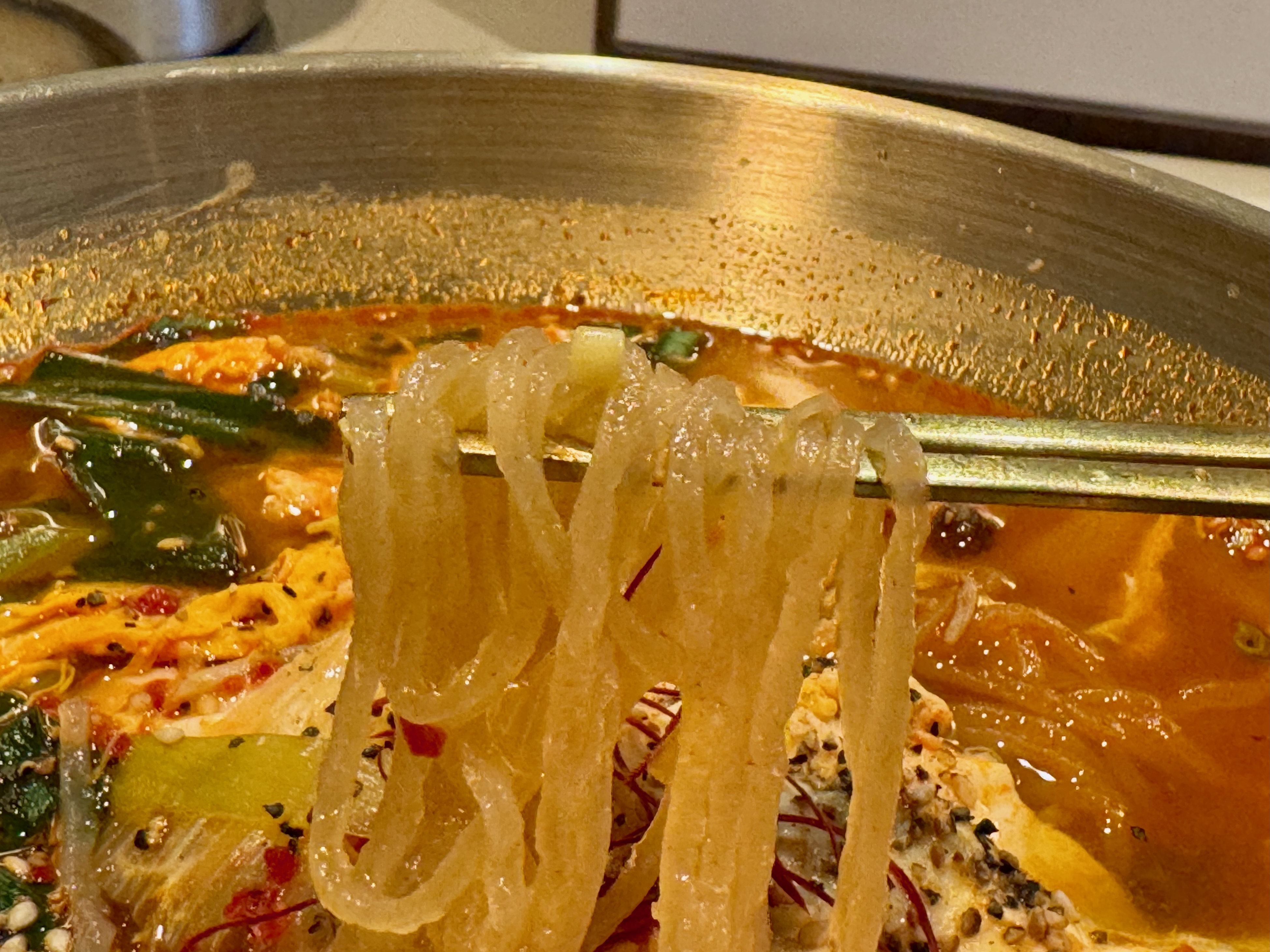 野菜や牛骨の旨味が溶け出したスープに、コチュジャンや唐辛子の辛みとニンニクの香りがふわっと重なってきます。