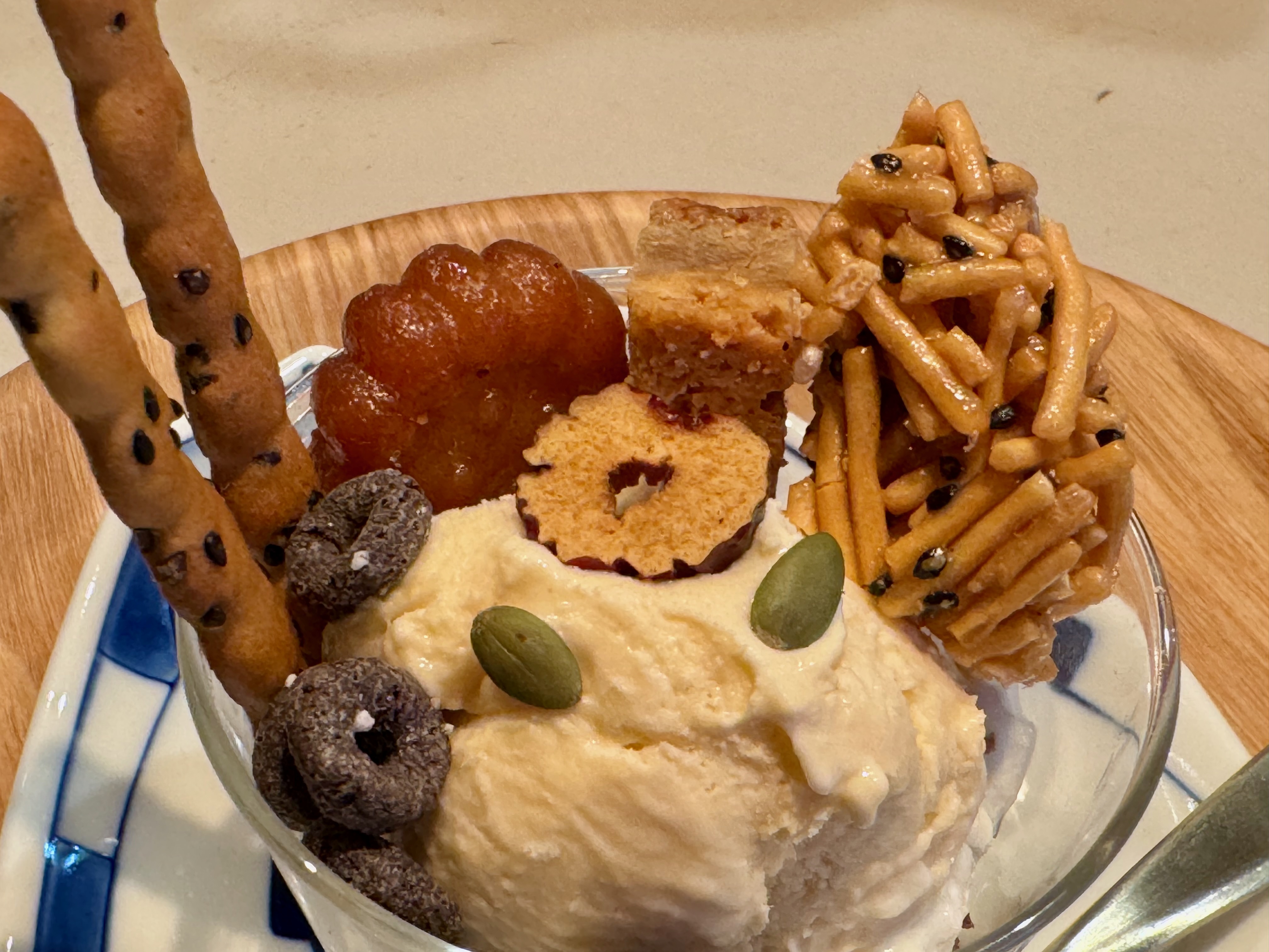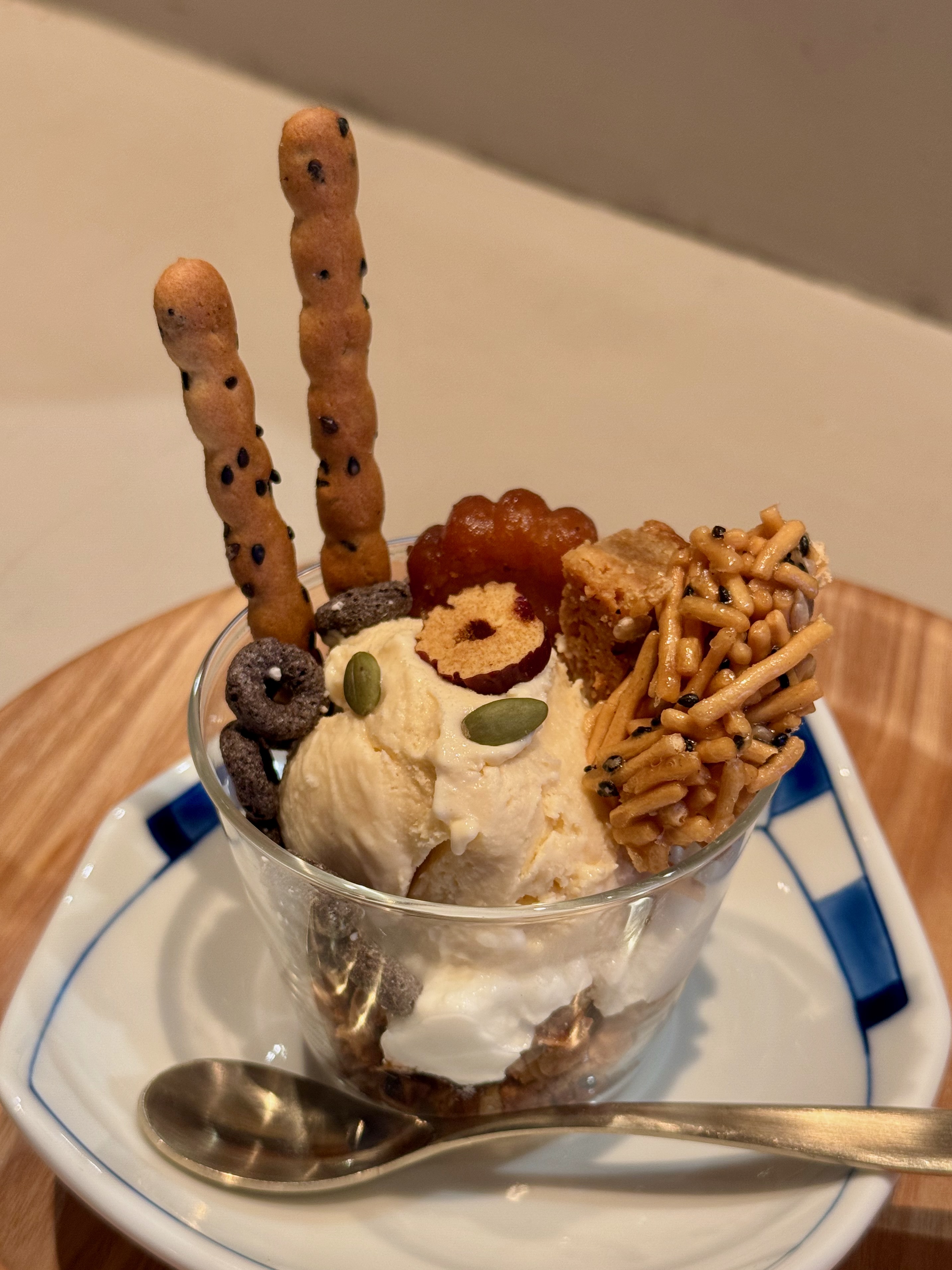 甘さは控えめで、食事のあとでも重く感じないのがうれしいポイントです。 特に印象に残ったのは、韓菓との相性を意識したような穀物感のあるトッピングで、香ばしさがアイスのミルキーさをきゅっと引き締めてくれました。